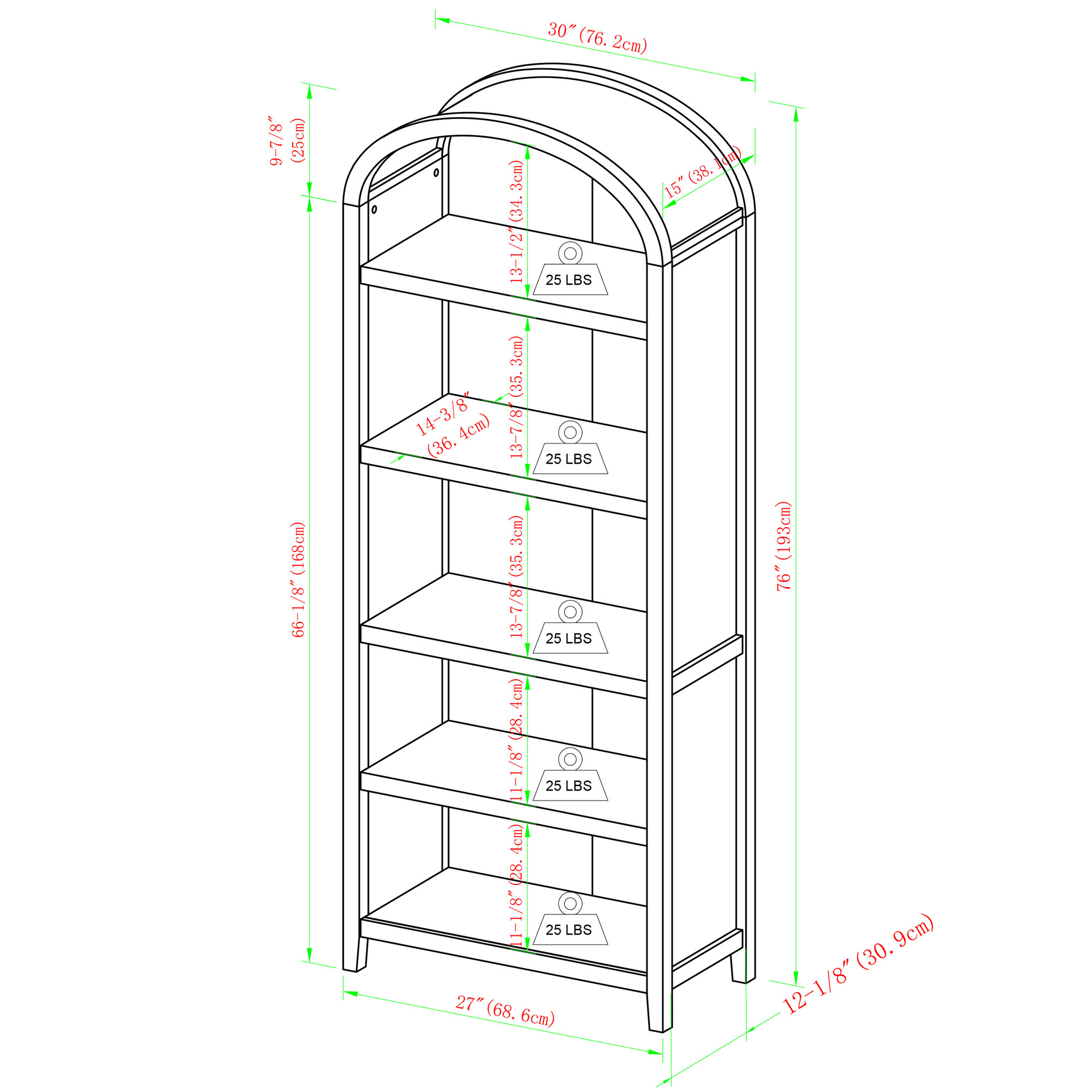 The Chantelle arched bookshelf combines functional storage with contemporary design. Standing 76 inches tall with five spacious open shelves, this freestanding unit provides ample space for books, decorative items, office supplies, or craft materials across multiple rooms in your home.