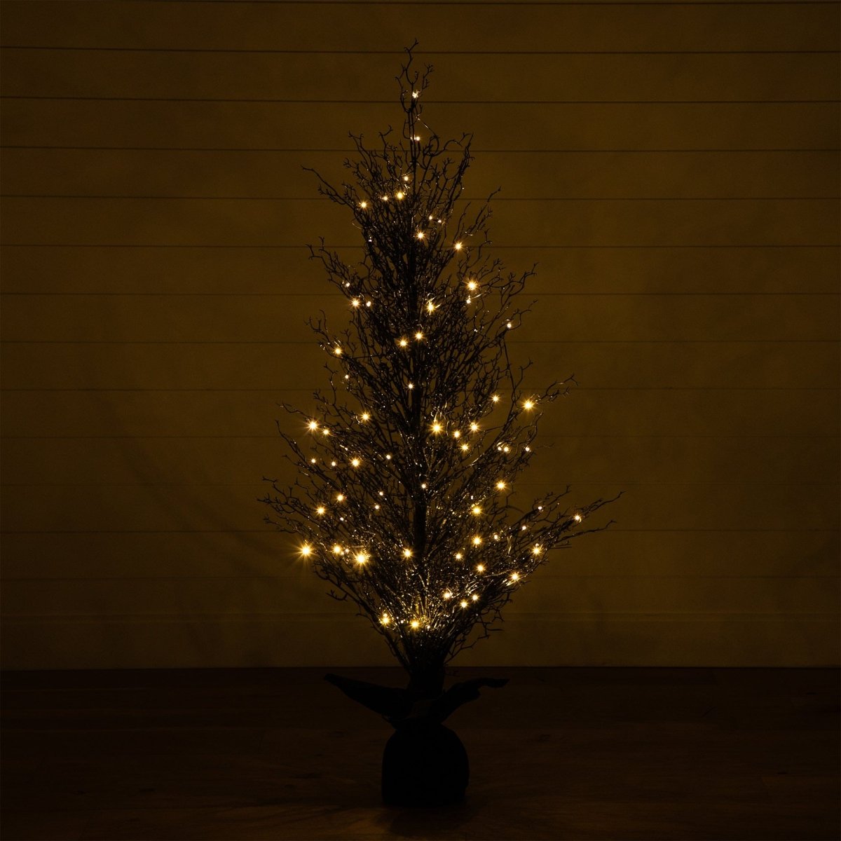 The tree includes 85 warm white LED lights distributed throughout the branches. These energy-efficient lights provide ambient illumination while maintaining low power consumption. The battery-operated system eliminates the need for nearby electrical outlets, offering placement flexibility in any room.