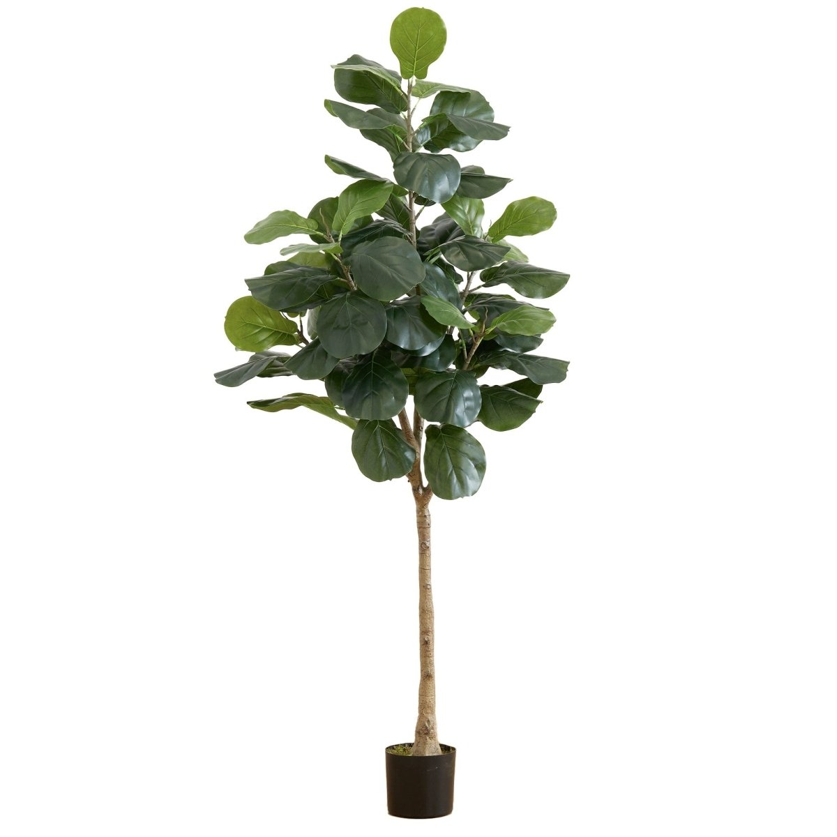 Introducing the queen bee of indoor plants! The notoriously difficult-to-grow fiddle leaf tree can now grace your space without maintenance. Inspired by the beauty of nature, our artificial fiddle leaf tree features large, glossy leaves that emanate from a lifelike trunk. Meticulously crafted by expert horticulturists using high-quality materials, its branches can even be bent to create a personalized look in your space. Standing tall at 6', it comes in a stylish nursery planter, ready to enhance any corner of your home. Enjoy the allure of this iconic plant without the hassle, and let its majestic presence reign in your living space.