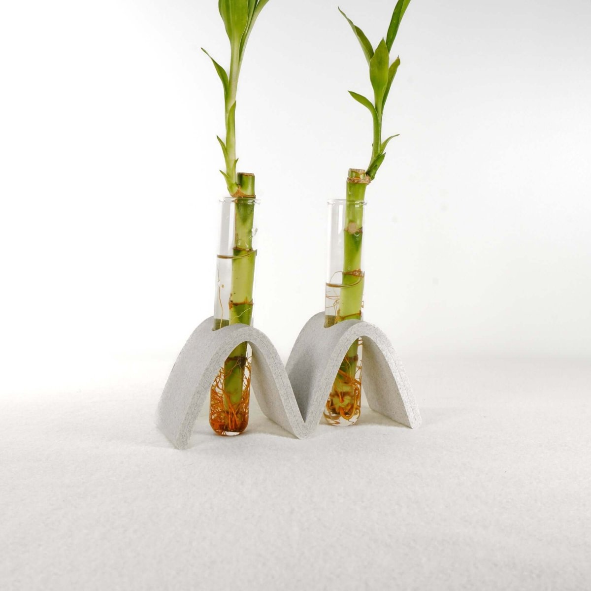 This Nordic-inspired propagation station features a distinctive arch wave design that combines modern aesthetics with practical plant care. The station includes two 25x150mm glass tubes (18mm diameter) securely held in a 3D printed base, creating a minimalist display perfect for rooting cuttings or showcasing decorative elements.