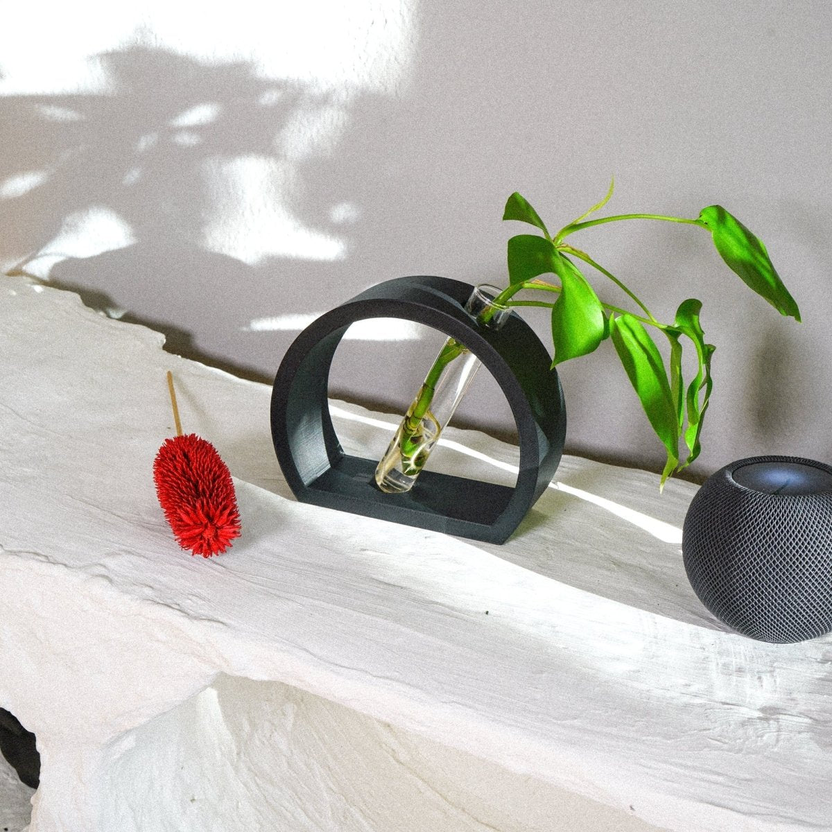 The half-moon shaped stand features a contemporary Nordic aesthetic that complements any interior space. Designed with a slight slant for visual interest, the station includes a perfectly etched groove that securely holds the glass tube in place. Despite the angled design, the tube remains stable and won't spill even when filled to the top with water.