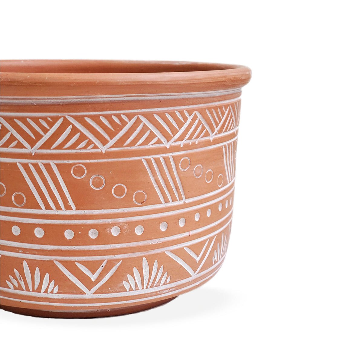 Hand-crafted from clay in small batch quantities, each pot is made by Fair Trade artisans in Bangladesh. This production method minimizes waste while ensuring quality control throughout the manufacturing process. The hand-etching technique creates unique geometric patterns that vary slightly from pot to pot, giving each piece individual character.