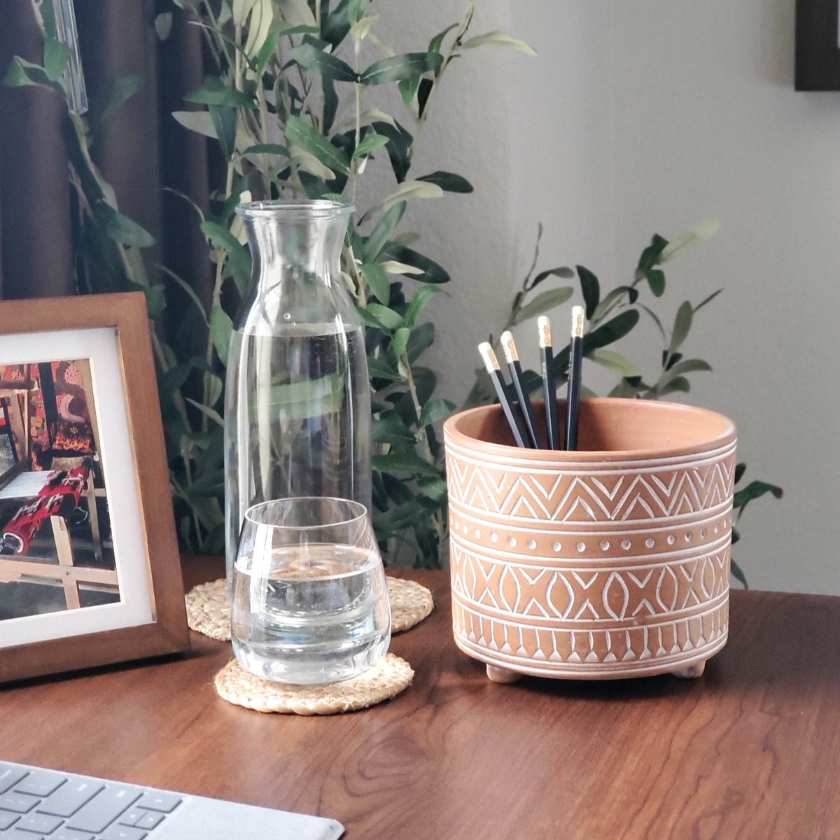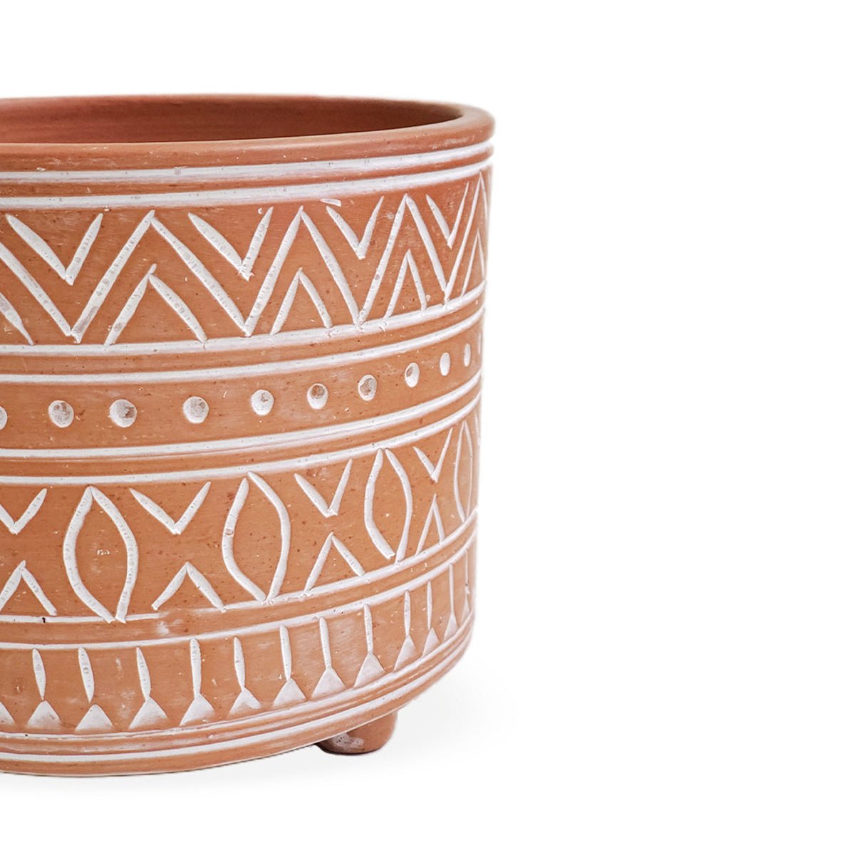 The natural terracotta finish complements any decor style while the compact size makes it ideal for small to medium plants, succulents, and herbs. The hand-etched geometric patterns add texture and dimension without overwhelming your space.