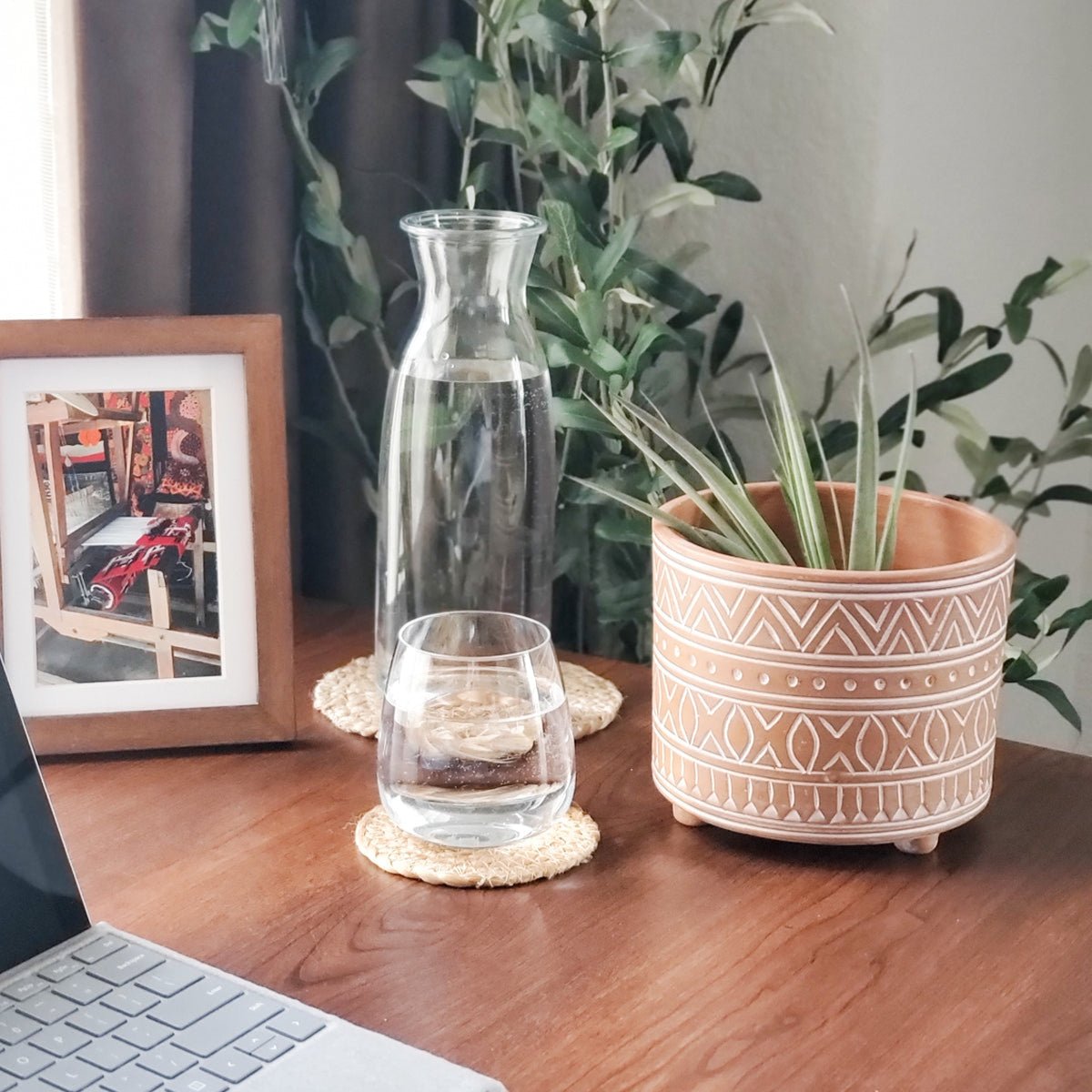 This handmade terracotta pot combines traditional craftsmanship with modern geometric design. Each pot features hand-etched patterns that create dynamic visual interest while providing a practical home for your plants. Measuring approximately 5.5" tall by 6.5" round, this small clay planter fits perfectly on desks, shelves, and windowsills.