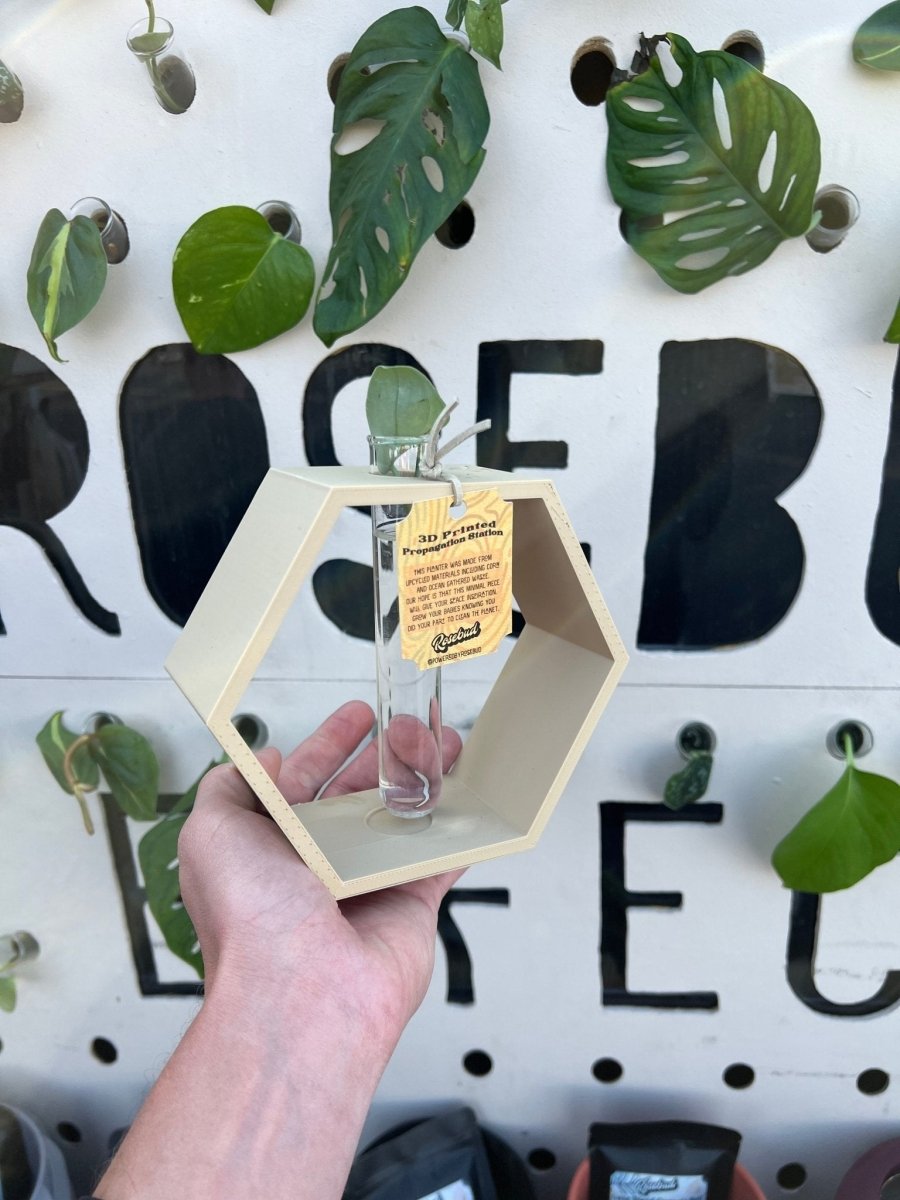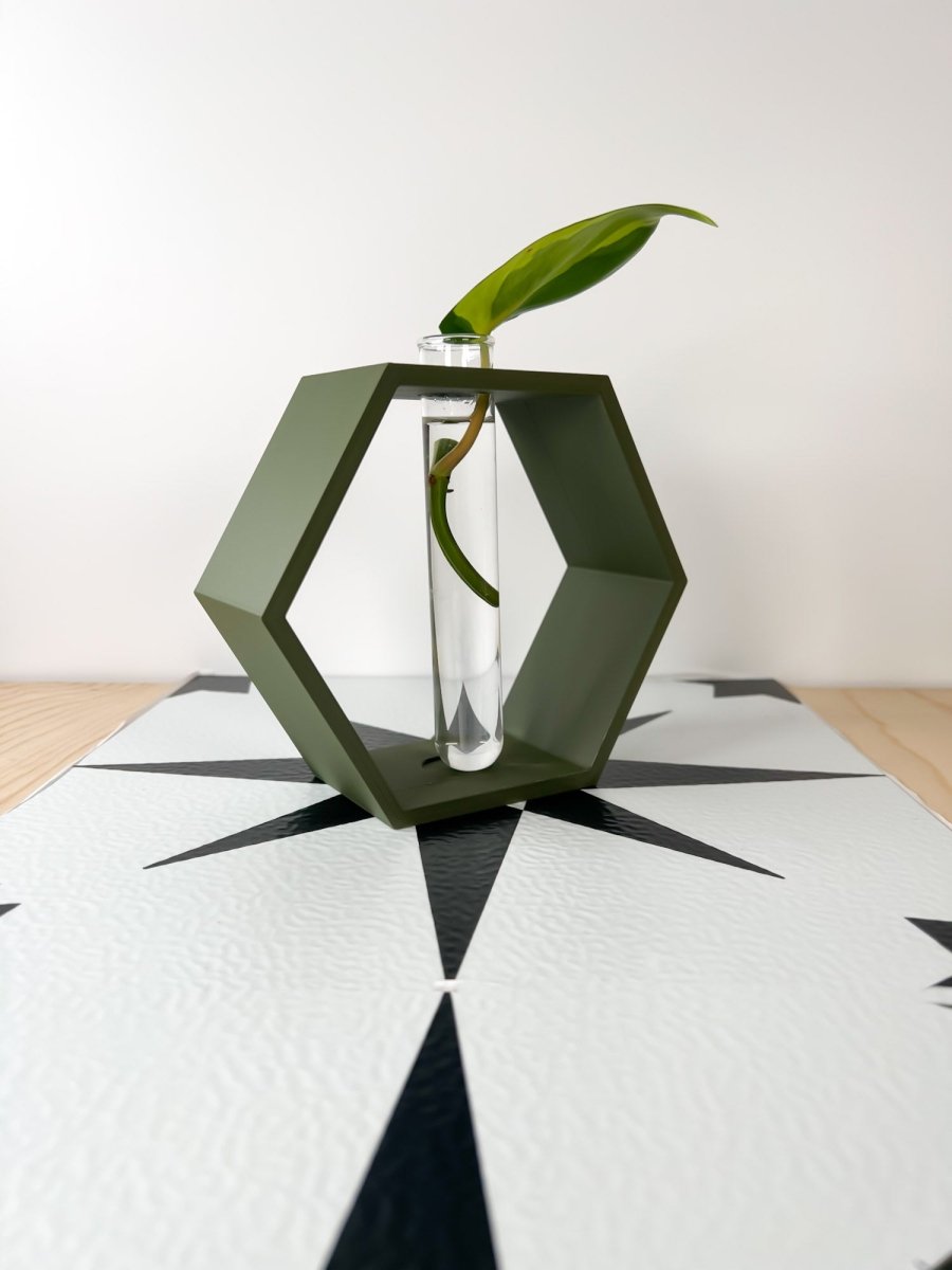 Each hexagon propagation station arrives with everything needed to start rooting your plant cuttings. The set includes a glass tube for holding water and plant stems, plus a sturdy stand that keeps the tube securely positioned. The 6.5" height provides ample space for longer cuttings while maintaining a compact footprint on desks, shelves, or coffee tables.