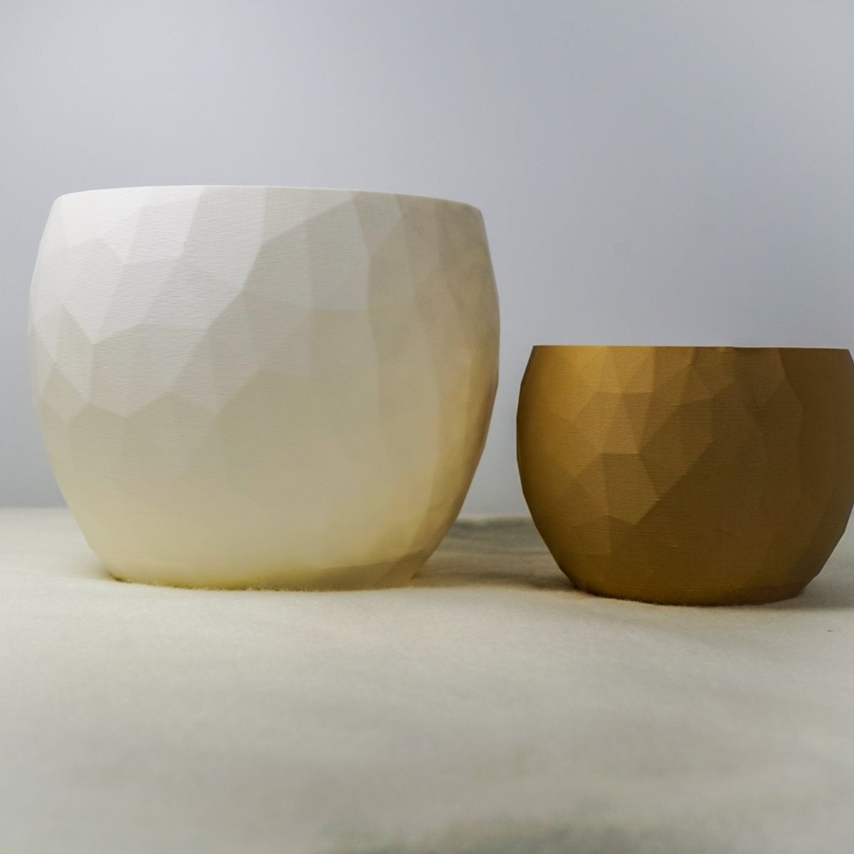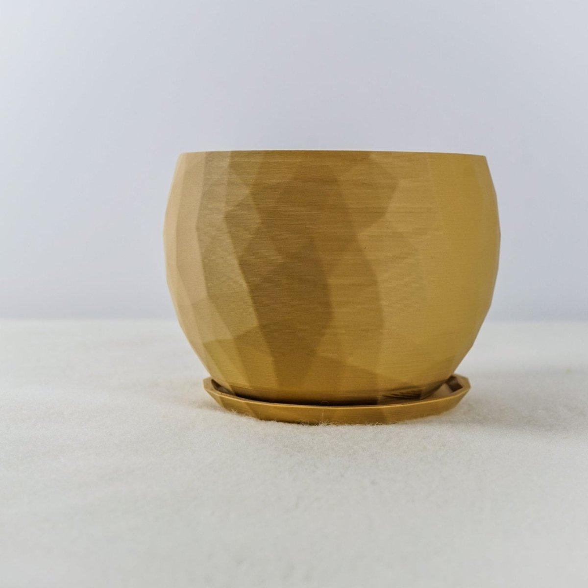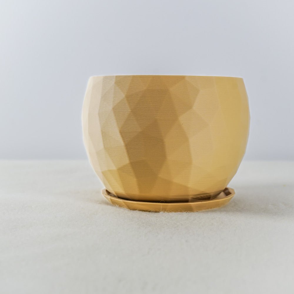 This geometric planter features an original Voronoi design that creates a distinctive pattern through 3D printed construction. The mathematical tessellation structure provides both visual interest and structural integrity while maintaining a lightweight profile.