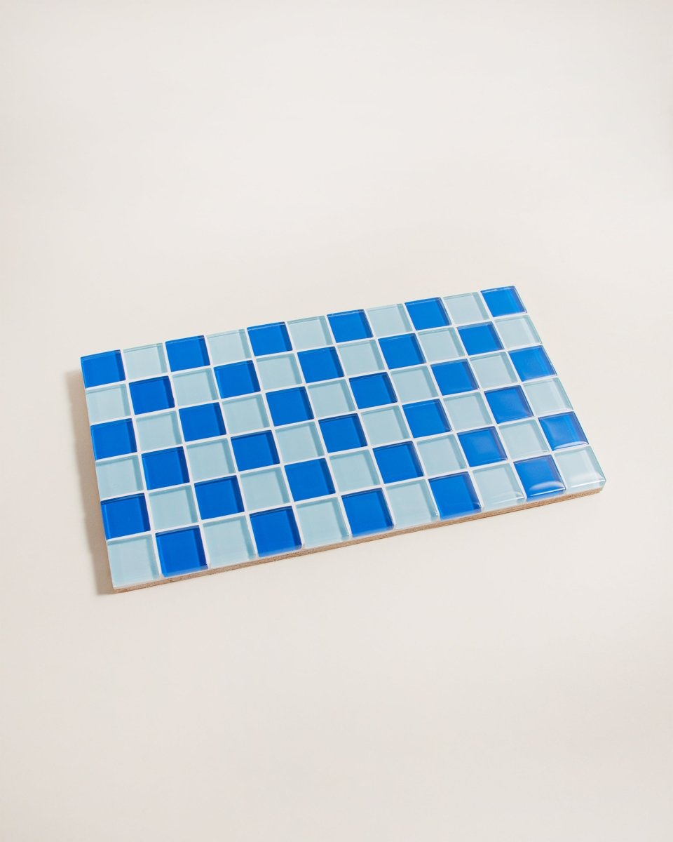 This handcrafted glass tile tray combines function and design with its striking light blue and dark blue checkered pattern. Made from high-quality, heat-resistant glass tiles, this rectangular tray measures 10 1/8" x 5.5" x 0.5", making it the perfect size for organizing jewelry, displaying candles, or serving hot drinks.