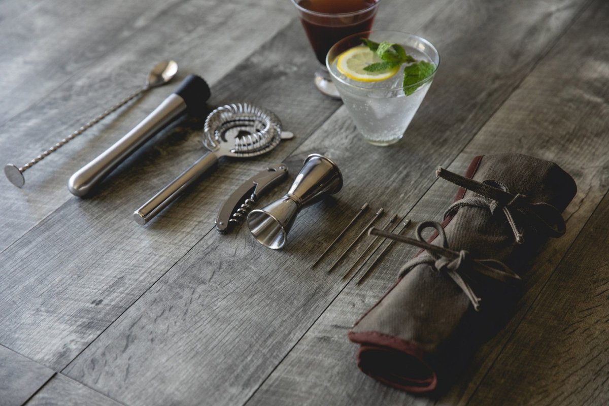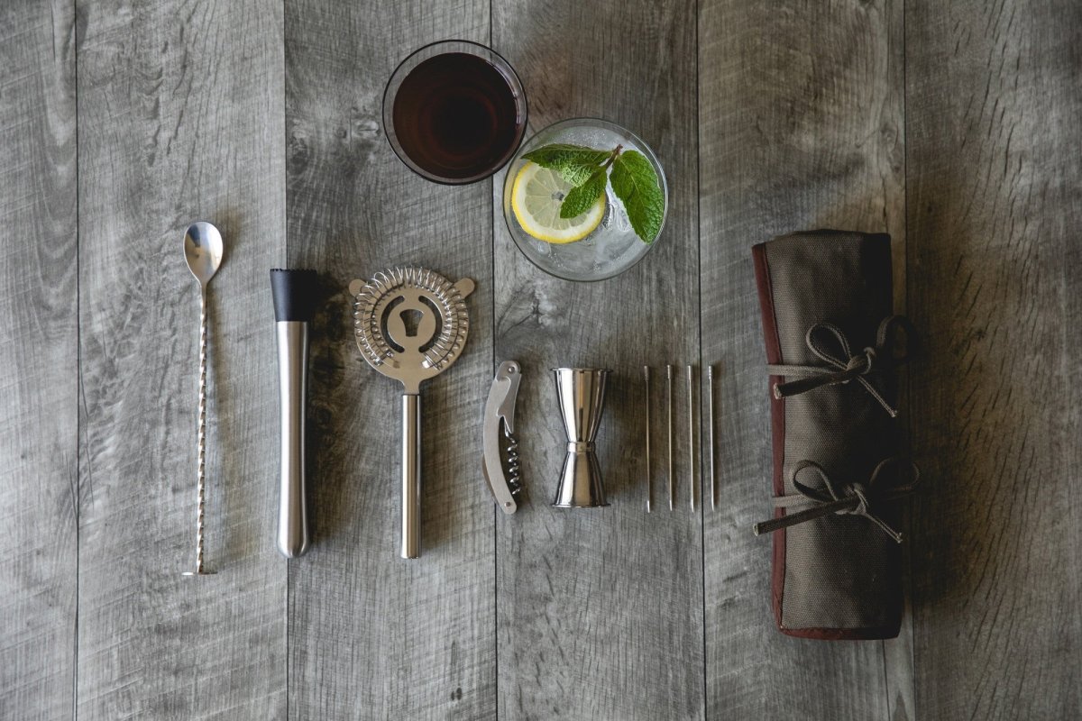 Each tool is crafted from stainless steel for durability and corrosion resistance. The materials ensure these tools maintain their performance through repeated use and cleaning. The set balances portability with professional functionality, making it suitable for both working bartenders and home enthusiasts who entertain in different locations.