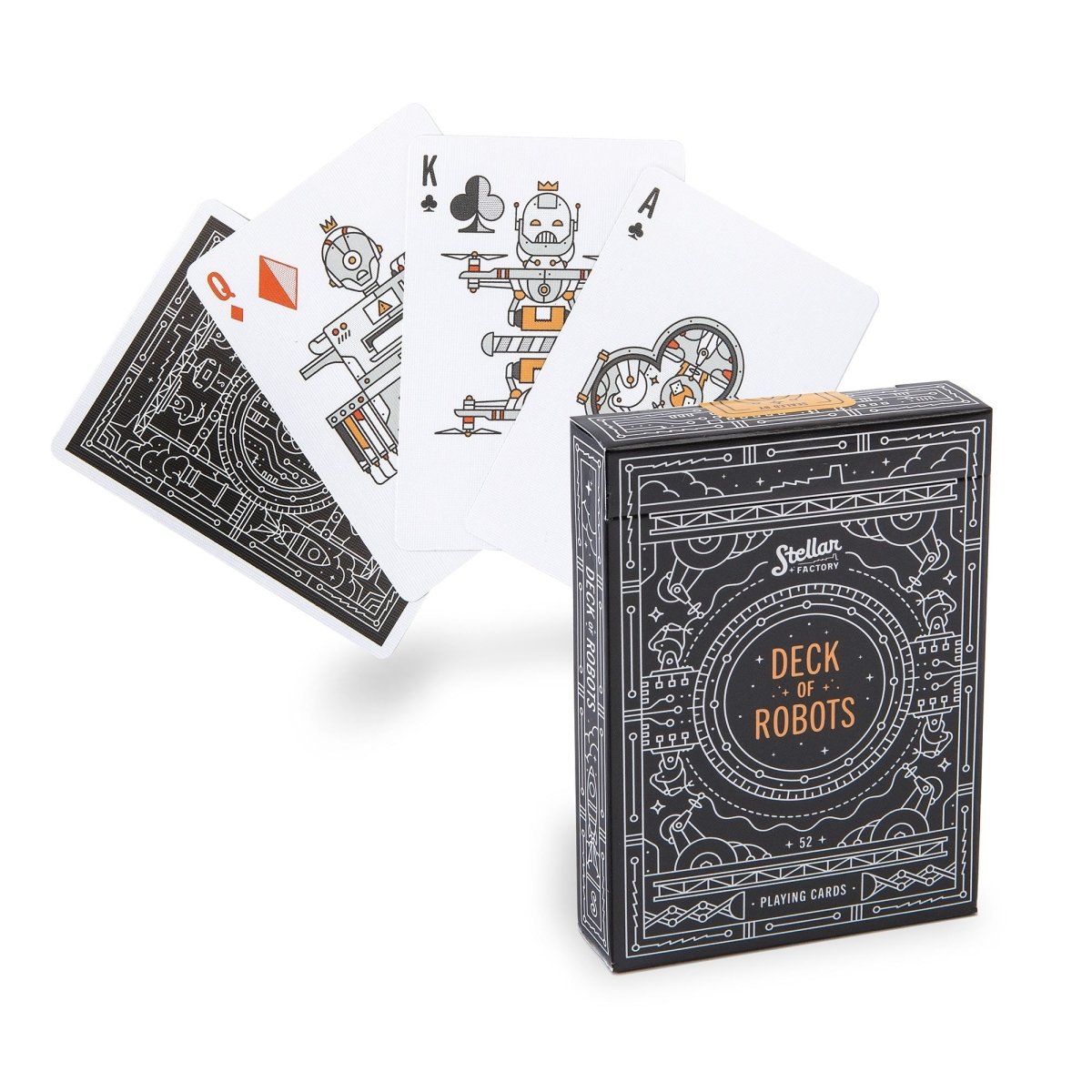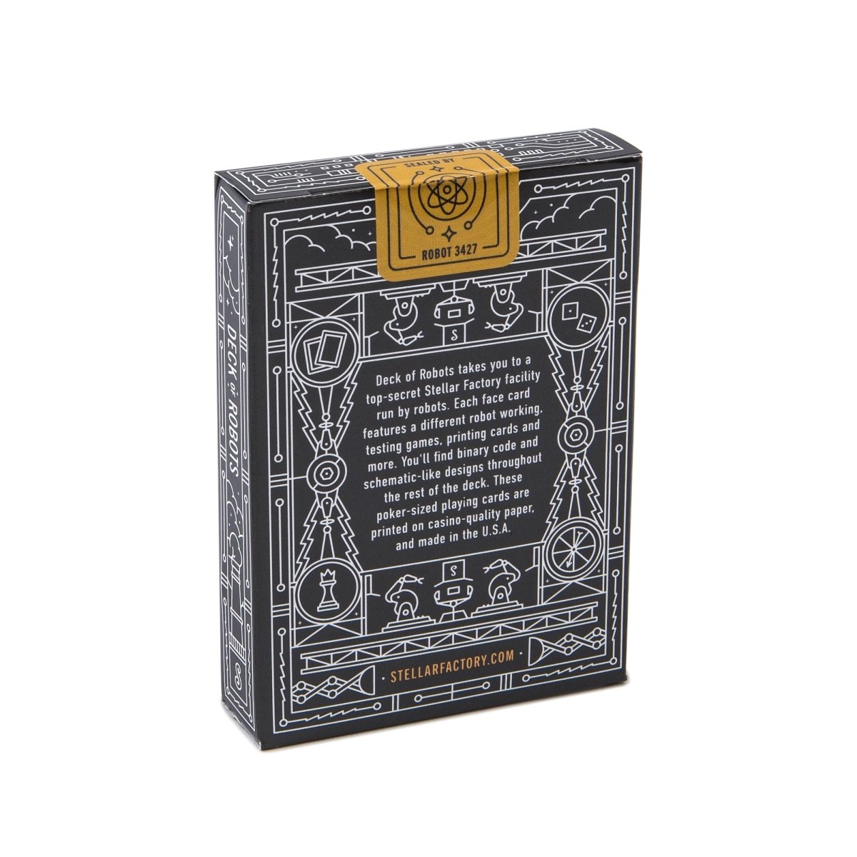 Deck of Robots brings you into one of Stellar Factory's remote facilities, which is run by robots. Printed on casino-quality paper, each face card features a wacky, but functional robot. Explore the details of each card to see where each robot works. You'll find them testing new games, printing new cards, and more.