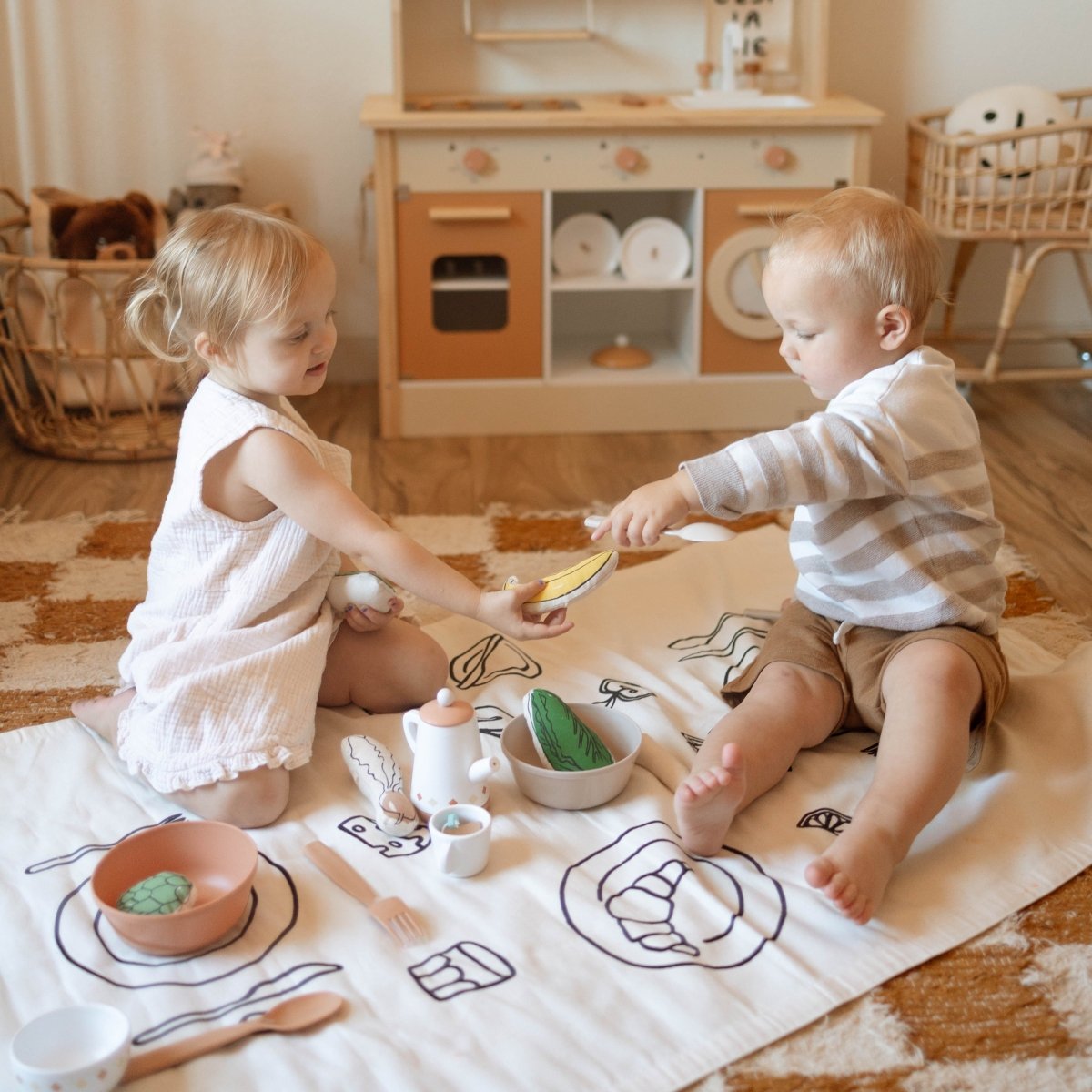 The printed dinner party table setting provides a defined play space that encourages role-play scenarios. Children can practice table manners, host pretend meals, and develop social skills through imaginative dinner party games. The neutral design complements any room decor while serving as a dedicated play area.