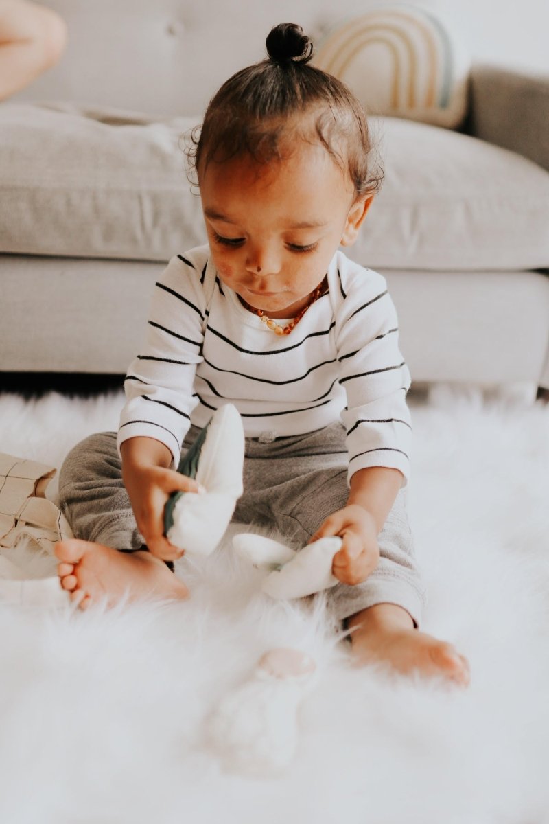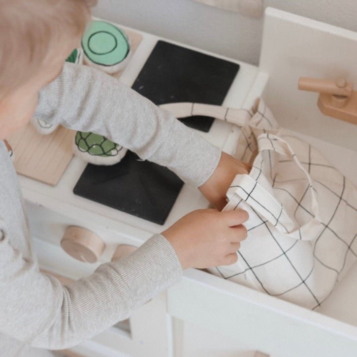 This natural canvas farmers market tote brings imaginative grocery shopping adventures to life. Designed for little hands, this 12in x 8in tote bag comes complete with 6 hand-sewn plush fruits and vegetables, making it the perfect pretend play set for toddlers and young children.