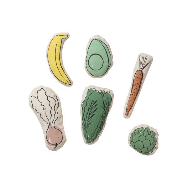 The set includes six hand-sewn produce pieces that children will recognize from real grocery trips: a bright yellow banana, detailed artichoke, leafy romaine lettuce, deep purple beet, green avocado, and orange carrot. Each piece is crafted with attention to detail, helping children learn about different fruits and vegetables through hands-on play.