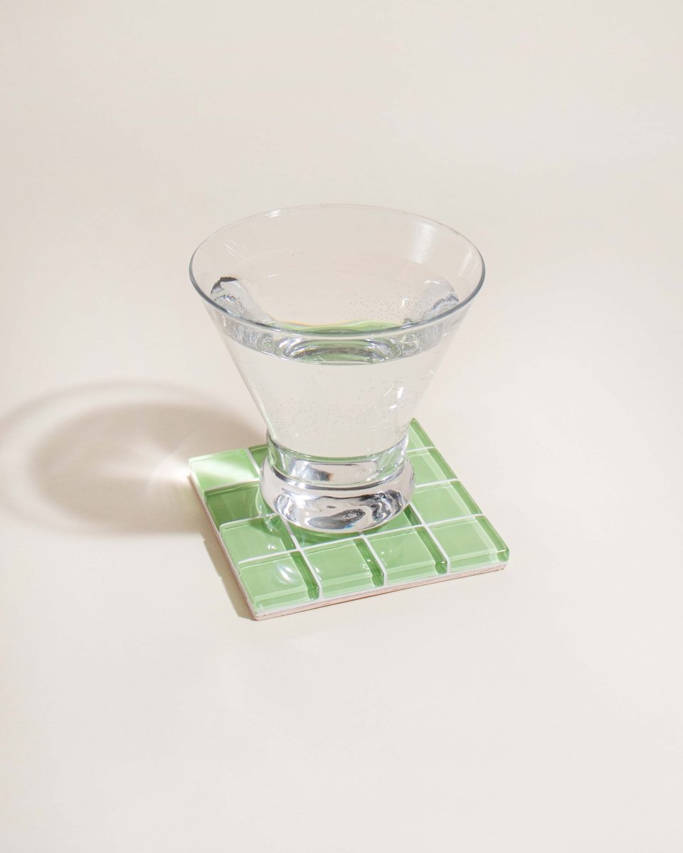 These handcrafted glass tile coasters feature a vibrant lime citrus design that adds a fresh, playful touch to your home bar or coffee table. Each coaster measures 3 5/8" square with a substantial 0.5" thickness, providing reliable protection for your furniture from hot drinks, cold beverages, and condensation.