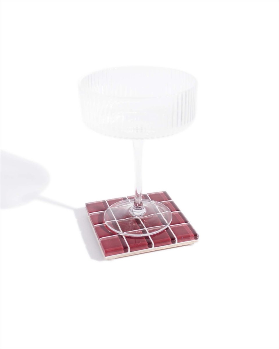 These handcrafted glass tile coasters combine functionality with artisan craftsmanship. Each coaster features a rich mulberry purple design, created through careful handwork that makes every piece unique. The thick glass construction provides reliable protection for your furniture while adding a decorative accent to your space.