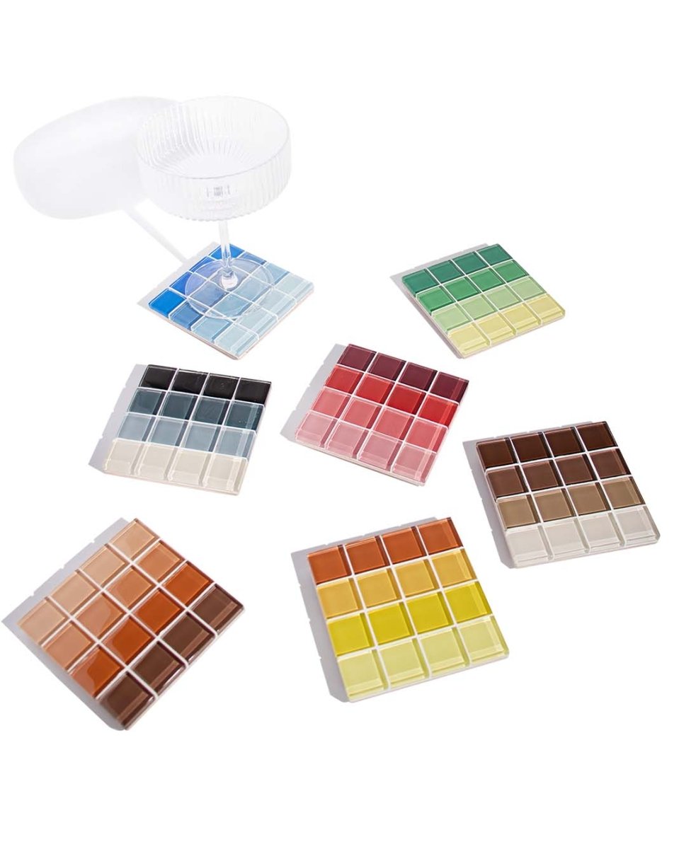 Measuring 3 5/8 inches in length and width, these coasters accommodate mugs, teacups, glasses, and standard drinkware. The glass tile surface offers stable support while the ombre pattern adds visual interest to your tabletop setup. They function equally well as photo props for styled shots or everyday use during entertaining.