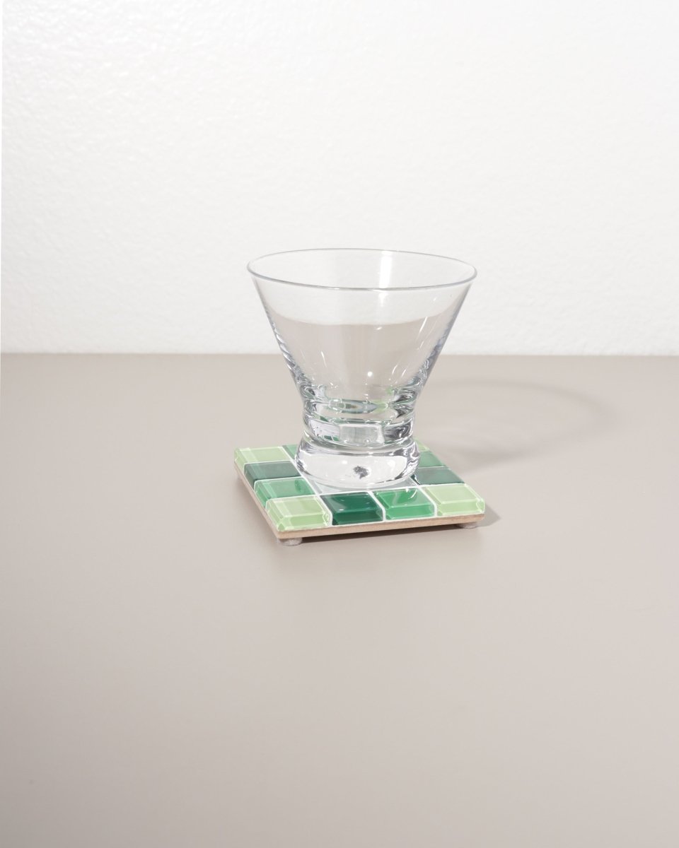 These handcrafted glass tile coasters combine functionality with artistic design, featuring a distinctive green gradient "Through A Window" pattern. Each coaster measures 3 5/8" square with a substantial 0.5" thickness, providing reliable protection for your furniture while serving as a decorative accent.