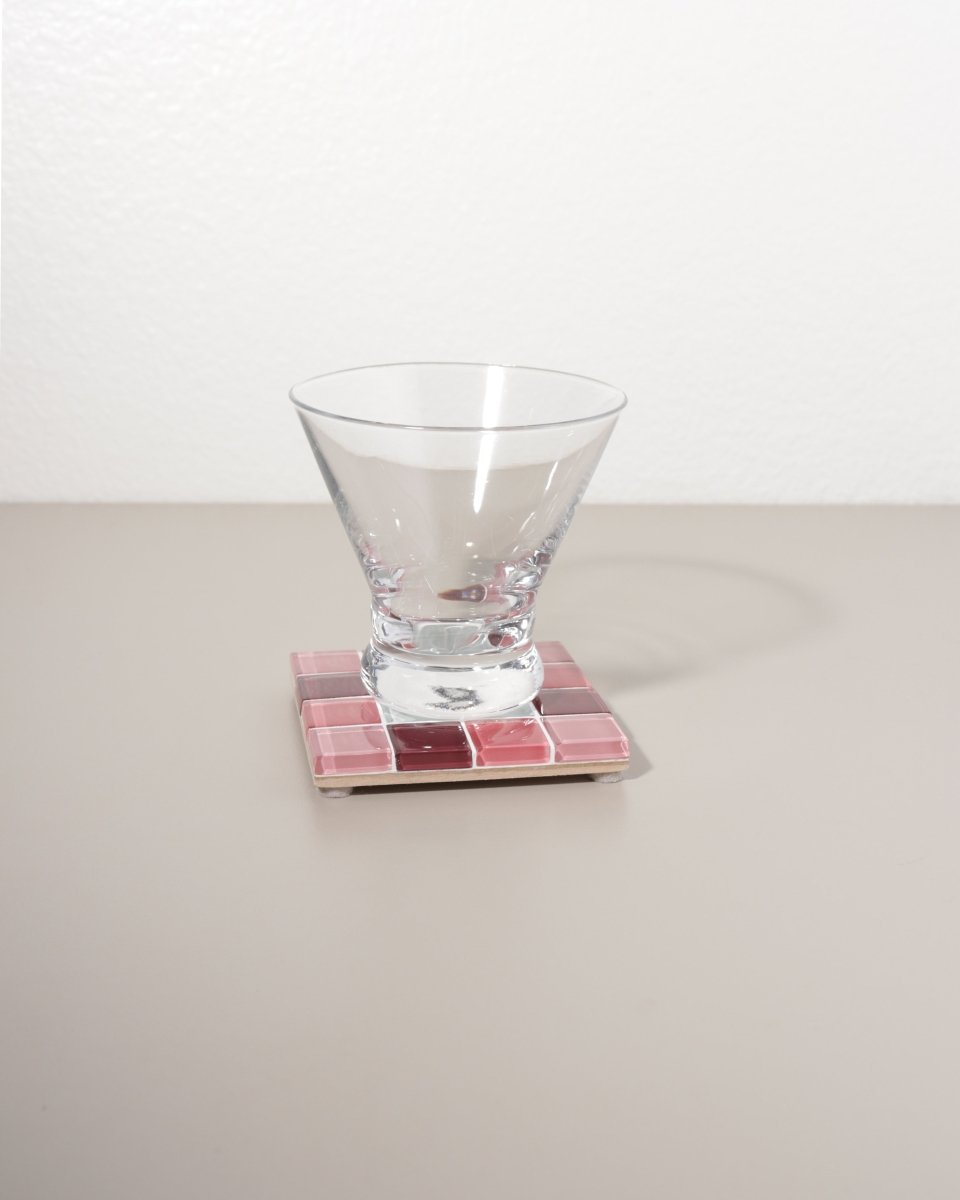 These handcrafted glass tile coasters combine functionality with artistic design, featuring a distinctive pink gradient "Through A Window" pattern. Built from thick, resilient glass tiles, each coaster measures 3 5/8" x 3 5/8" x 0.5" and provides reliable protection for your mugs, teacups, and glasses.