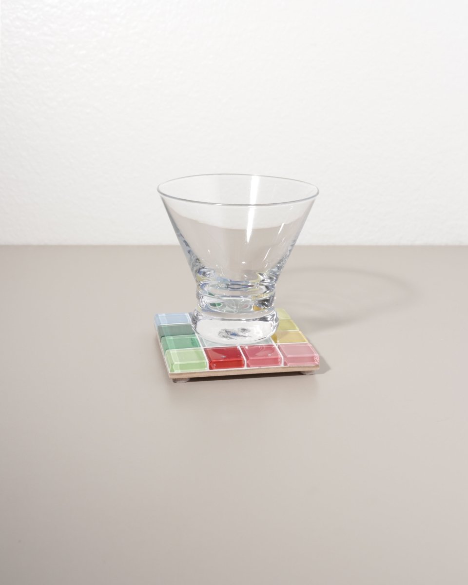 These handcrafted glass tile coasters combine functional protection with artistic design, featuring a distinctive rainbow "Through A Window" pattern. Each coaster measures 3 5/8" square with a substantial 0.5" thickness, providing reliable protection for your furniture from hot beverages, cold drinks, and condensation.