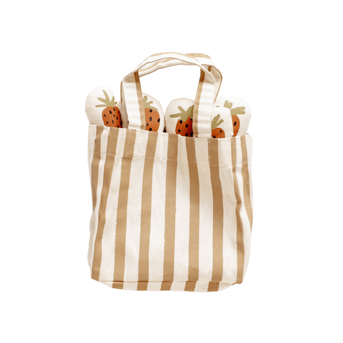 This interactive strawberry tote combines a functional canvas bag with engaging pretend play elements. The 8x12 inch natural canvas tote includes 5 hand-sewn strawberries in varying sizes, designed specifically for small hands and imaginative play scenarios.