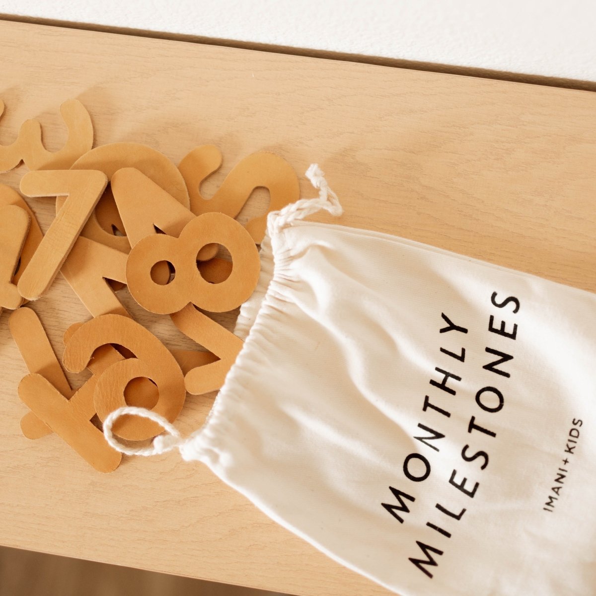 Track your baby's first year with these handcrafted monthly milestone markers. Each set features 17 tan leather pieces made from upcycled leather scraps, screen printed by hand by empowered artisans in Mombasa, Kenya. The natural canvas drawstring bag keeps all pieces organized and protected.