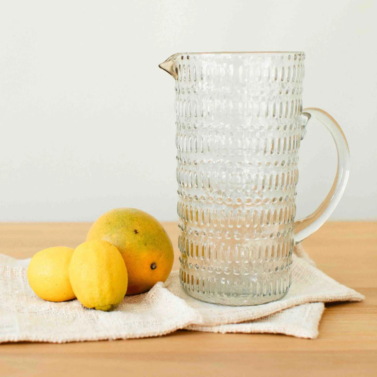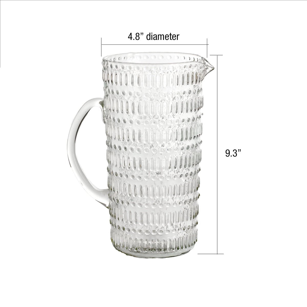 Crafted from 100% glass with approximately 50% recycled content, this pitcher combines environmental responsibility with practical design. The textured dot-dash pattern creates visual interest while providing a secure grip. At 4.8 inches in diameter and 9.3 inches tall, the pitcher offers a balanced profile that fits comfortably in refrigerator doors and on dining tables.