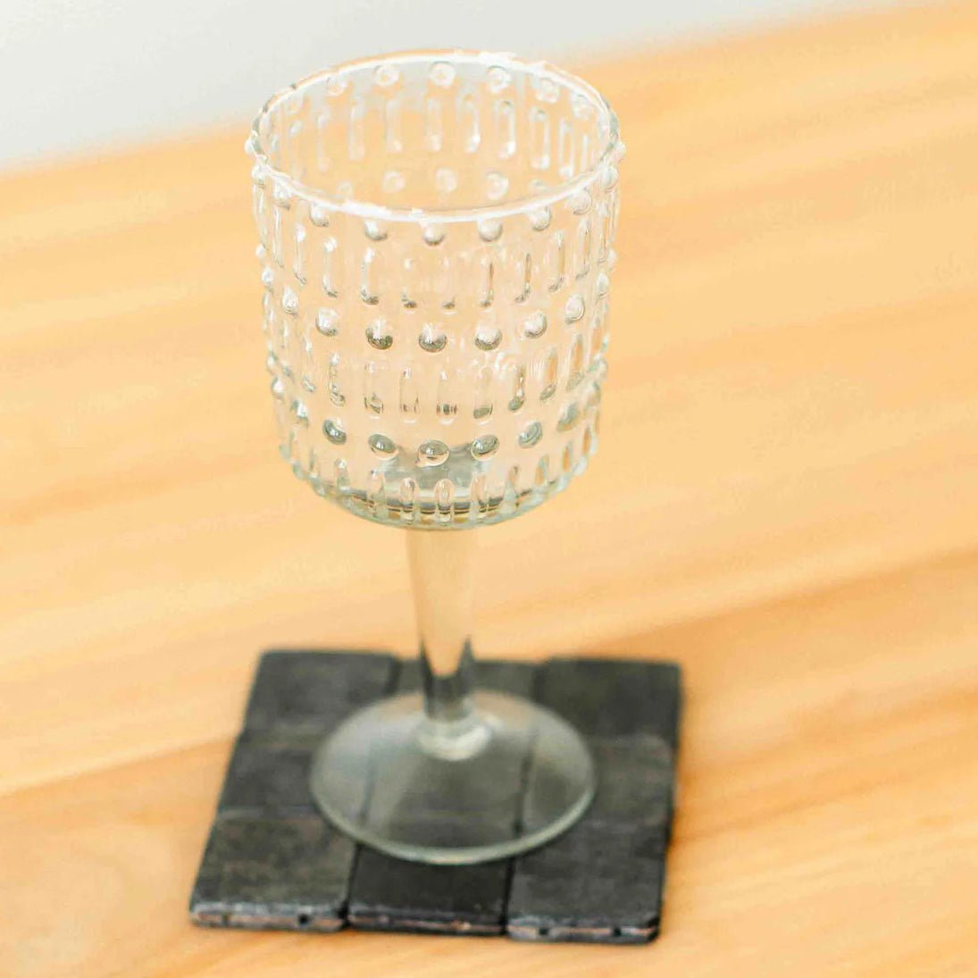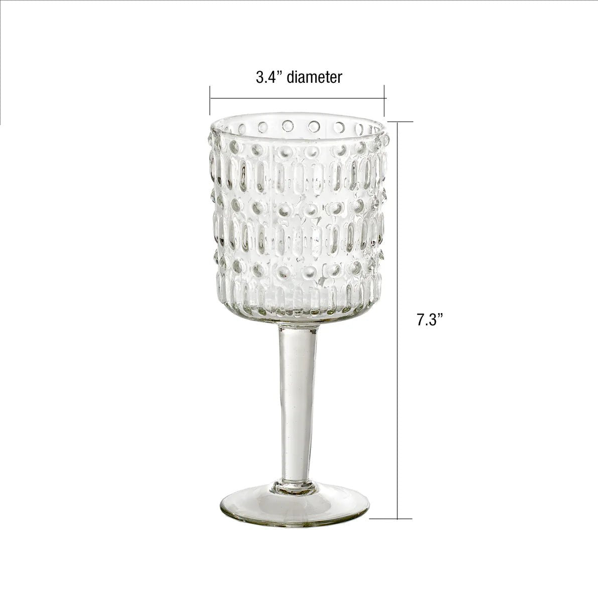 This 12.5 oz wine glass combines distinctive design with practical functionality. The textured dot and dash pattern adds visual interest while providing a secure grip. At 7.3 inches tall with a 3.4-inch diameter, this stemware fits comfortably in hand and stores easily in standard cabinets.