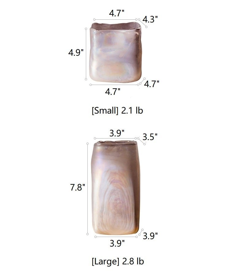 Choose from two distinct size options to suit your space. The small version measures 4.3 inches wide, 4.7 inches deep, and 4.9 inches high, weighing 2.1 pounds. The large version stands taller at 7.8 inches high, with a narrower profile of 3.5 inches wide and 3.9 inches deep, weighing 2.8 pounds. Both sizes offer substantial weight and presence, reflecting the quality of the thick glass construction.