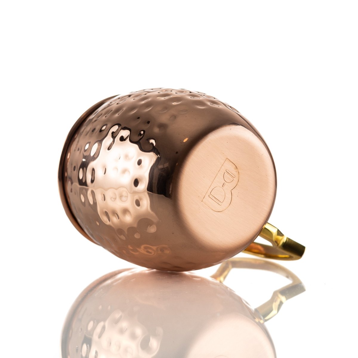 The hammered texture creates a distinctive appearance that catches light from multiple angles. Each mug features this textured surface across the entire copper body, making it an eye-catching addition to your drinkware collection. The hammered pattern is part of the traditional design that copper mule mugs are known for.