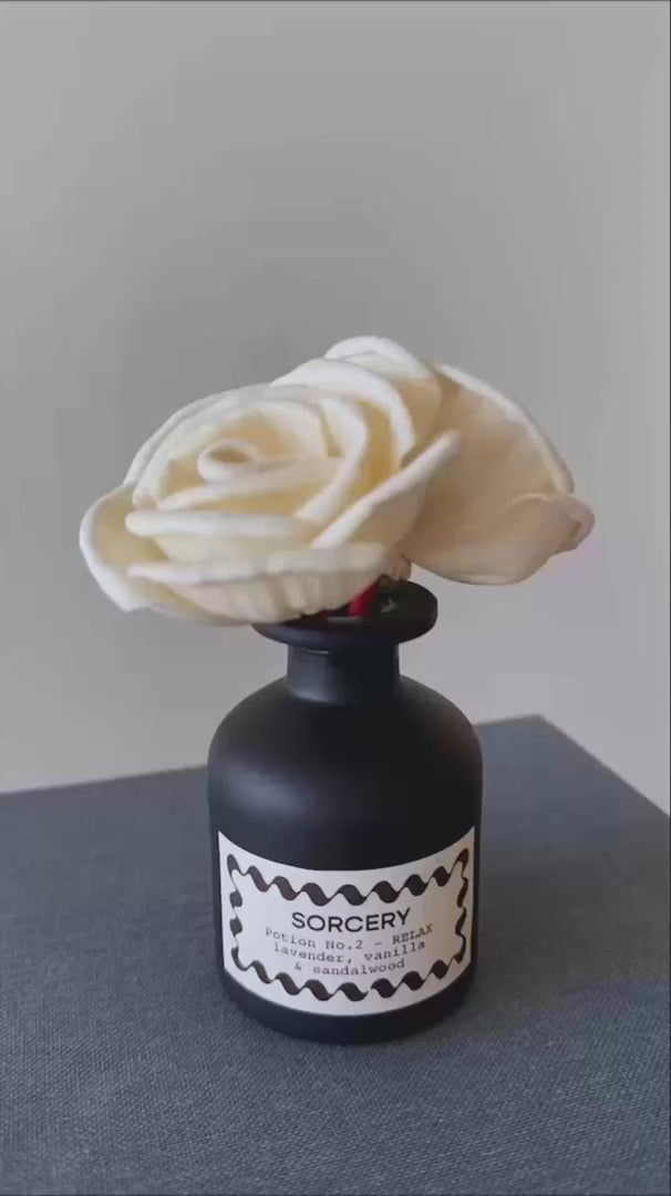 Experience the enchantment of this premium essential oil diffuser that does more than just fragrance your home - it creates a mesmerizing visual display. Watch as the elegant diffuser flowers gradually shift from white to red, adding a captivating touch of magic to any room while filling your space with the soothing scent of Potion #2 - Chill.