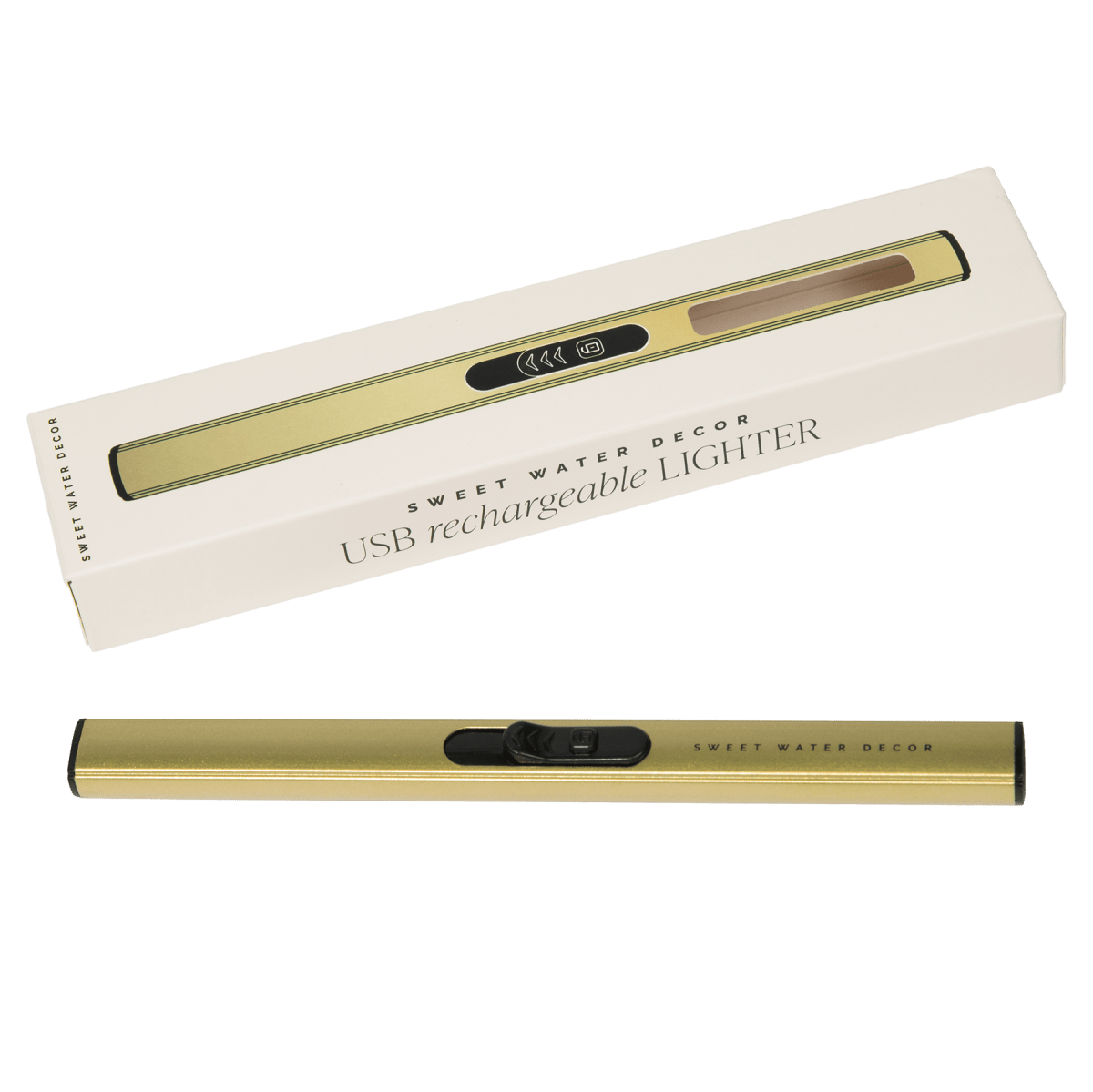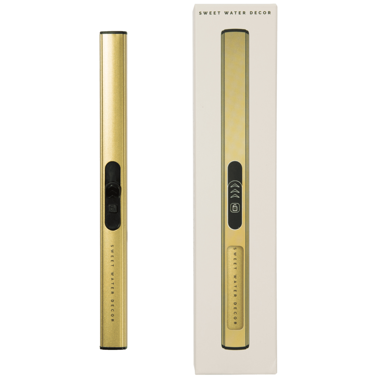 This rechargeable electric lighter combines functionality with style in an ultra-thin aluminum alloy design. The gold finish creates an attractive accessory that eliminates the need for disposable butane lighters, making it an environmentally friendly choice for lighting candles, incense, and more.