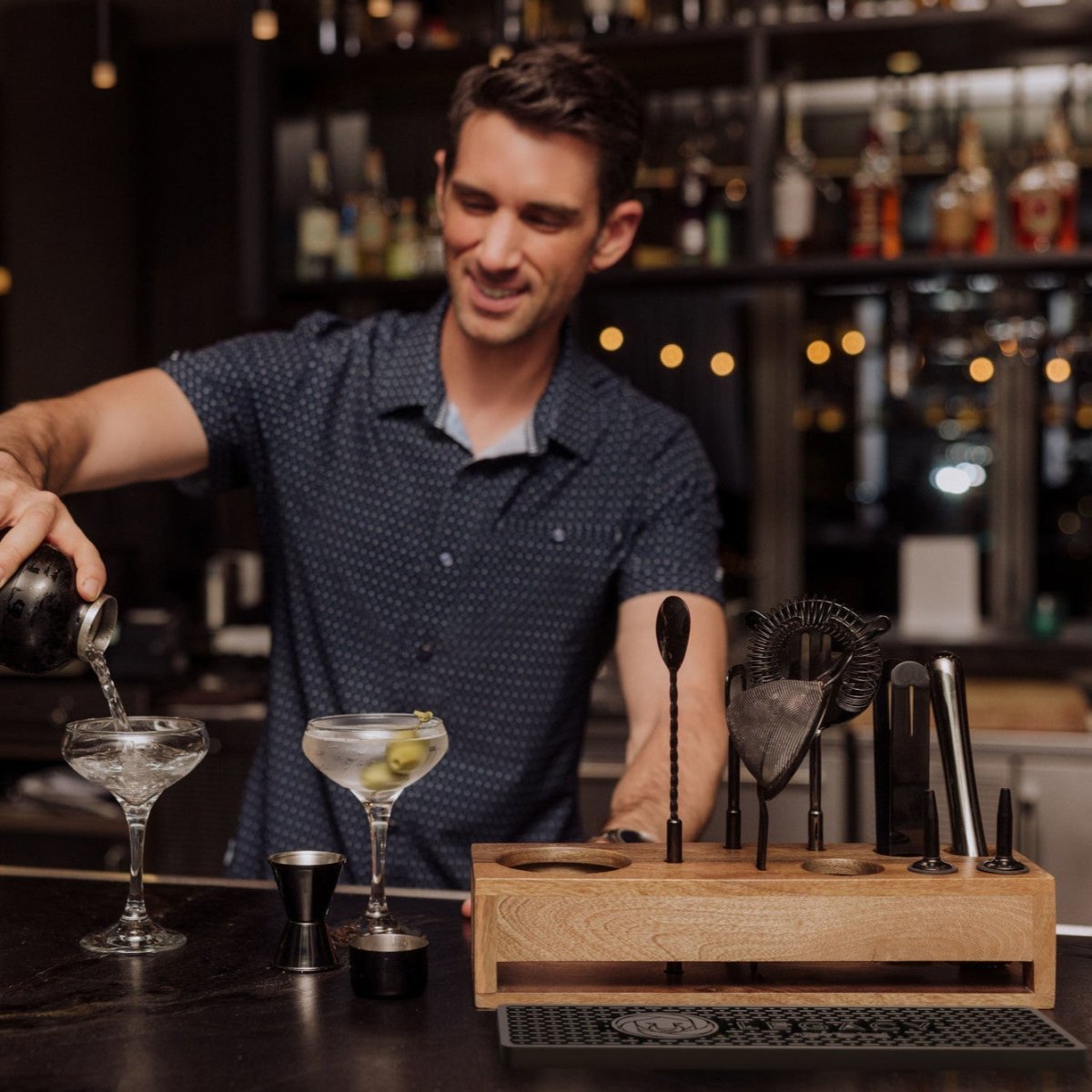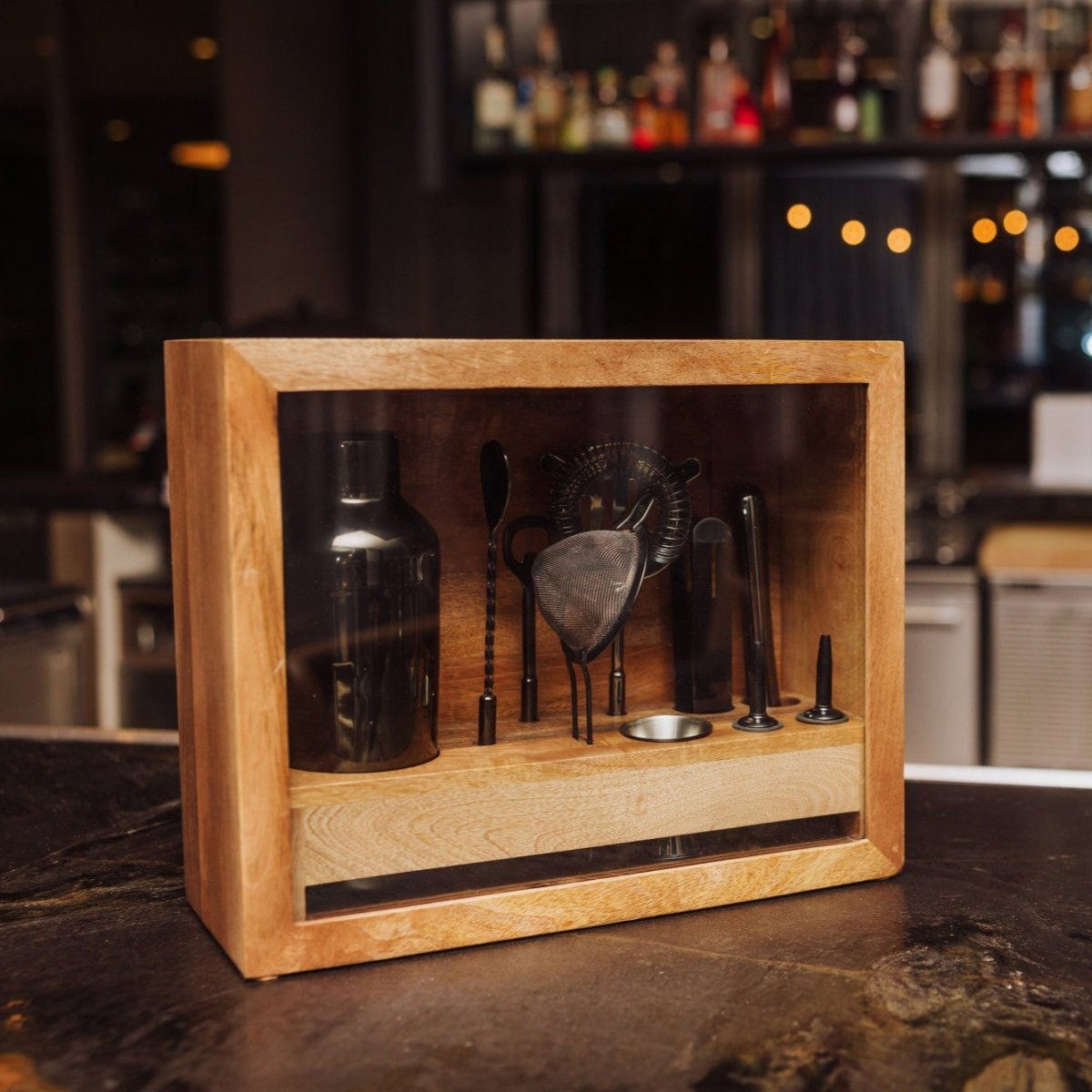 Regular price $169.95The Old Fashioned Bartender Kit is a compact, professional-grade cocktail tool set for the sustainably-minded mixologist. With a case made of sustainable mango wood sourced from India, this travel bartending set features a 10-piece array of black stainless steel tools including shaker, strainer, skimmer, stir spoon, bottle opener, muddler, tongs, jigger, pour spouts, and bar mat.