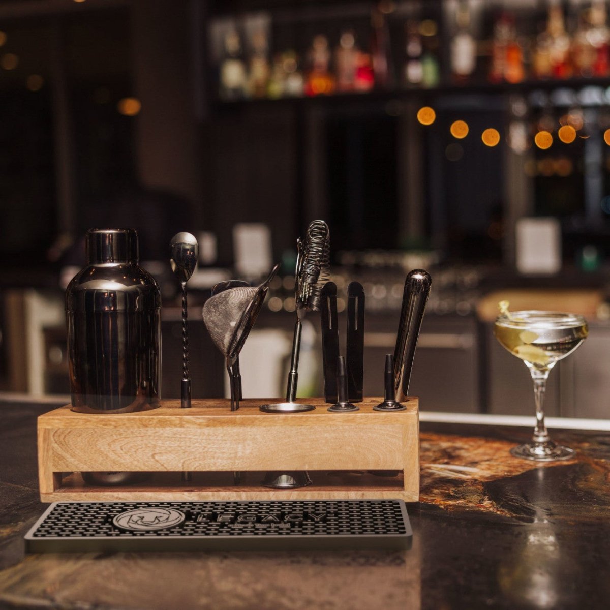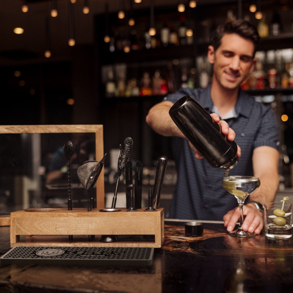 The Old Fashioned Bartender Kit is a compact, professional-grade cocktail tool set for the sustainably-minded mixologist. With a case made of sustainable mango wood sourced from India, this travel bartending set features a 10-piece array of black stainless steel tools including shaker, strainer, skimmer, stir spoon, bottle opener, muddler, tongs, jigger, pour spouts, and bar mat.