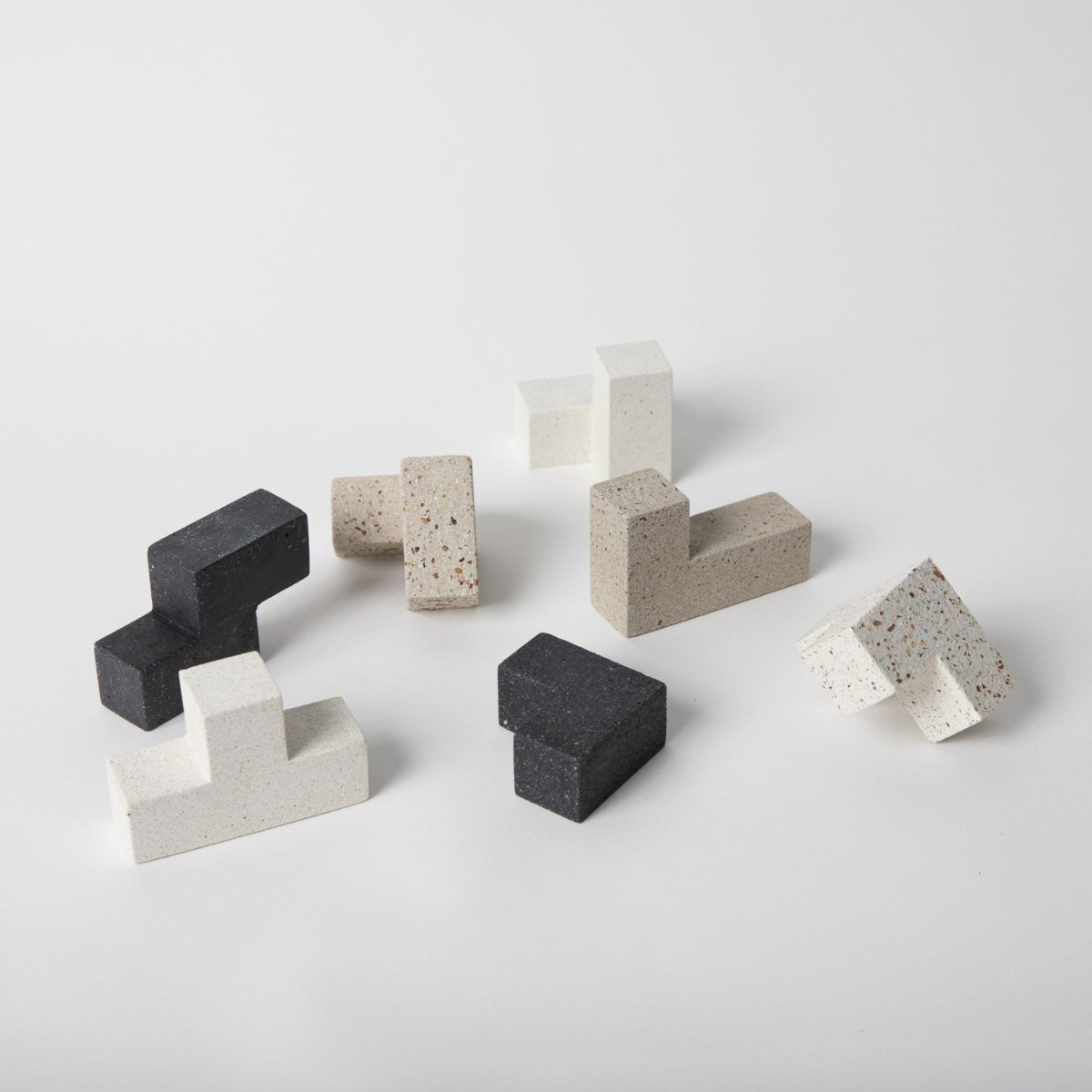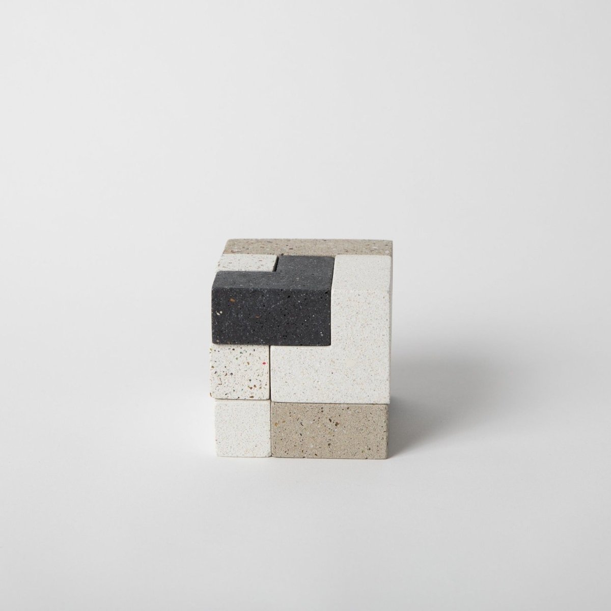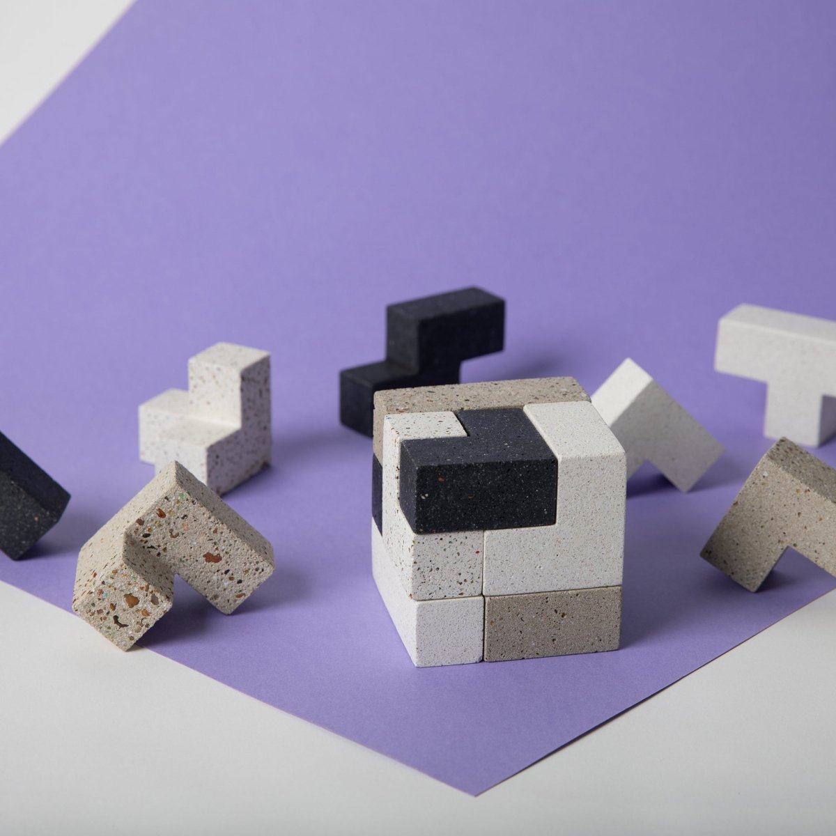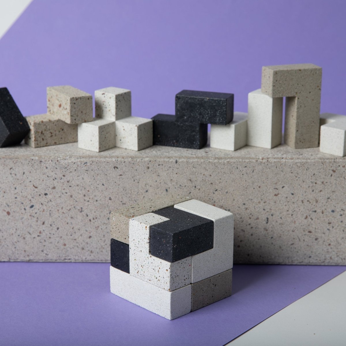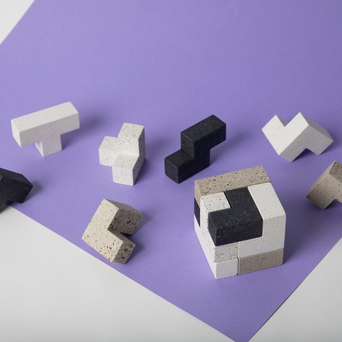 This handcrafted concrete soma cube combines the classic 7-piece puzzle with modern industrial design. Made from terrazzo-style concrete mixed with recycled glass, each cube offers 240 possible solutions for an engaging mental challenge.