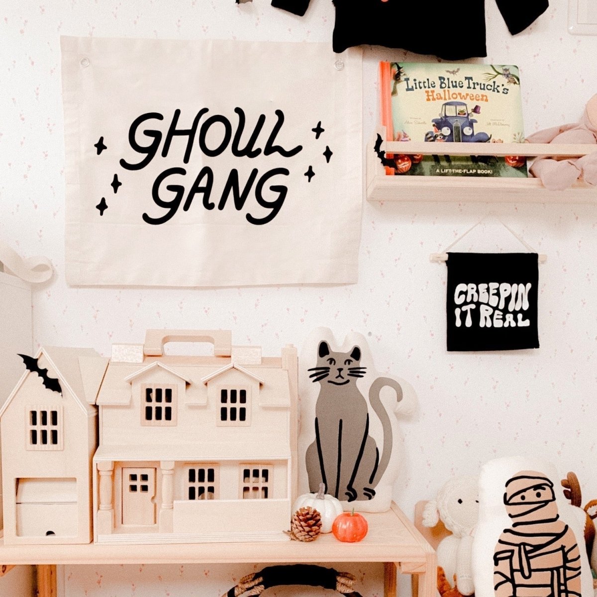This Halloween hang sign brings playful spooky charm to your seasonal decor. The "Creepin' It Real" design features black screen print on black canvas, creating a subtle yet striking look perfect for Halloween enthusiasts who appreciate minimalist style.