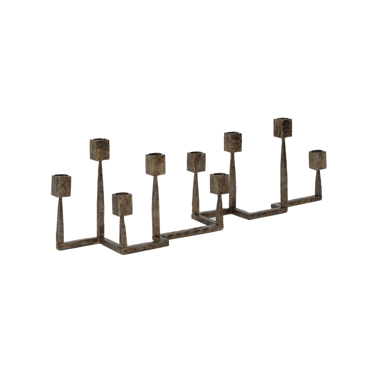 This candelabra features authentic hand-forged steel construction, created through traditional metalworking techniques. The hand-hammering process creates unique textural variations across the surface, ensuring each piece displays distinctive character. The forging method brings out the natural golden undertones inherent in the steel, resulting in a finish that shifts between copper, gold, and brown hues depending on ambient lighting conditions.