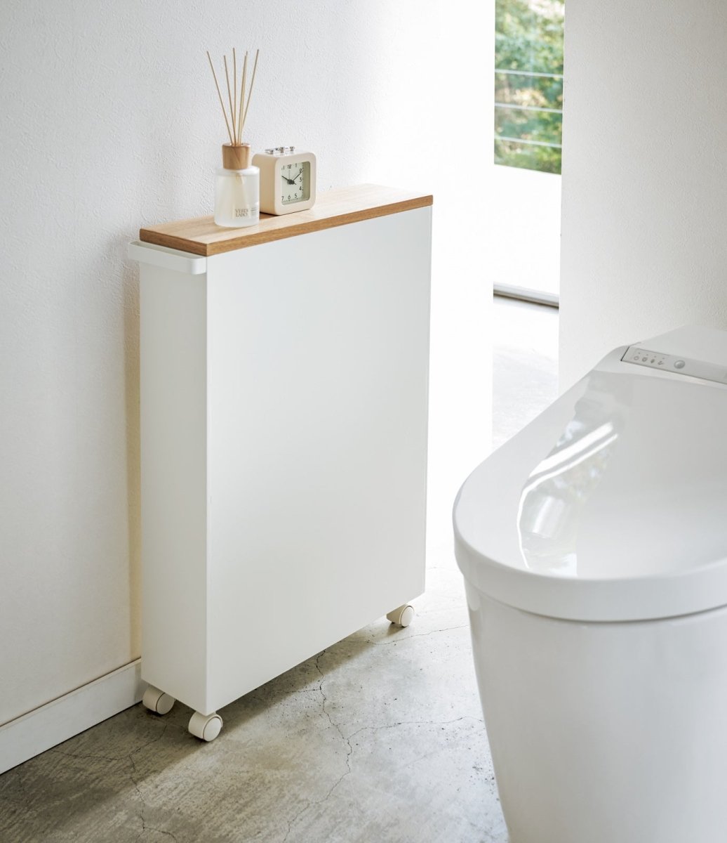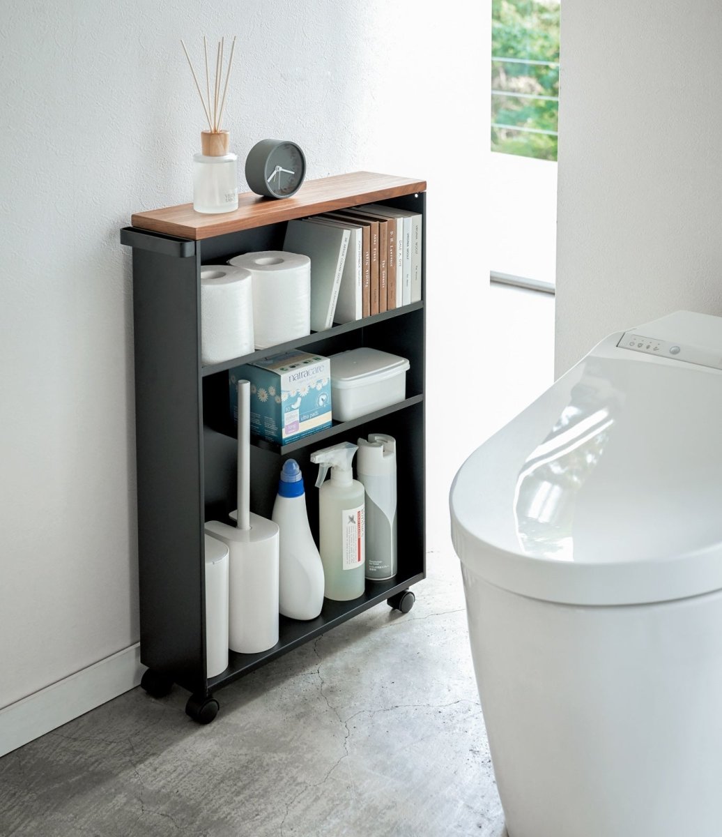 You’ll never run out of bathroom essentials, like toilet paper, cleaners, and other bathroom products with this minimalist, discreet rolling cart. Its slim profile makes this cart perfectly at home facing toward or away from walls, or nestled between tight spaces.