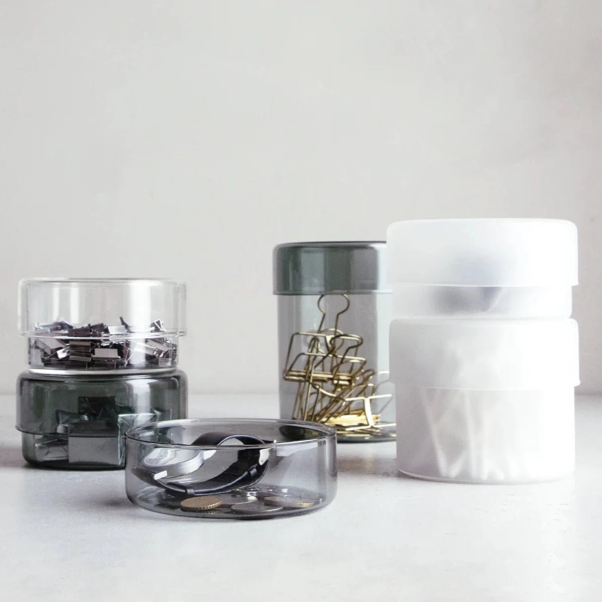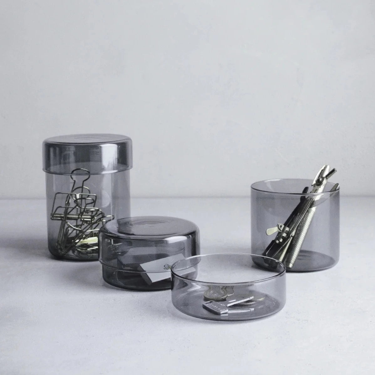 SCHALE is a glass case with a simple design. It comes in three different finishes, clear, smoke and frost. From casual to elegant spaces, it blends in well with a variety of scenes such as the living room, kitchen, bathroom, and desktop. Made of heat-resistant glass, it can be also used for storing food inside.