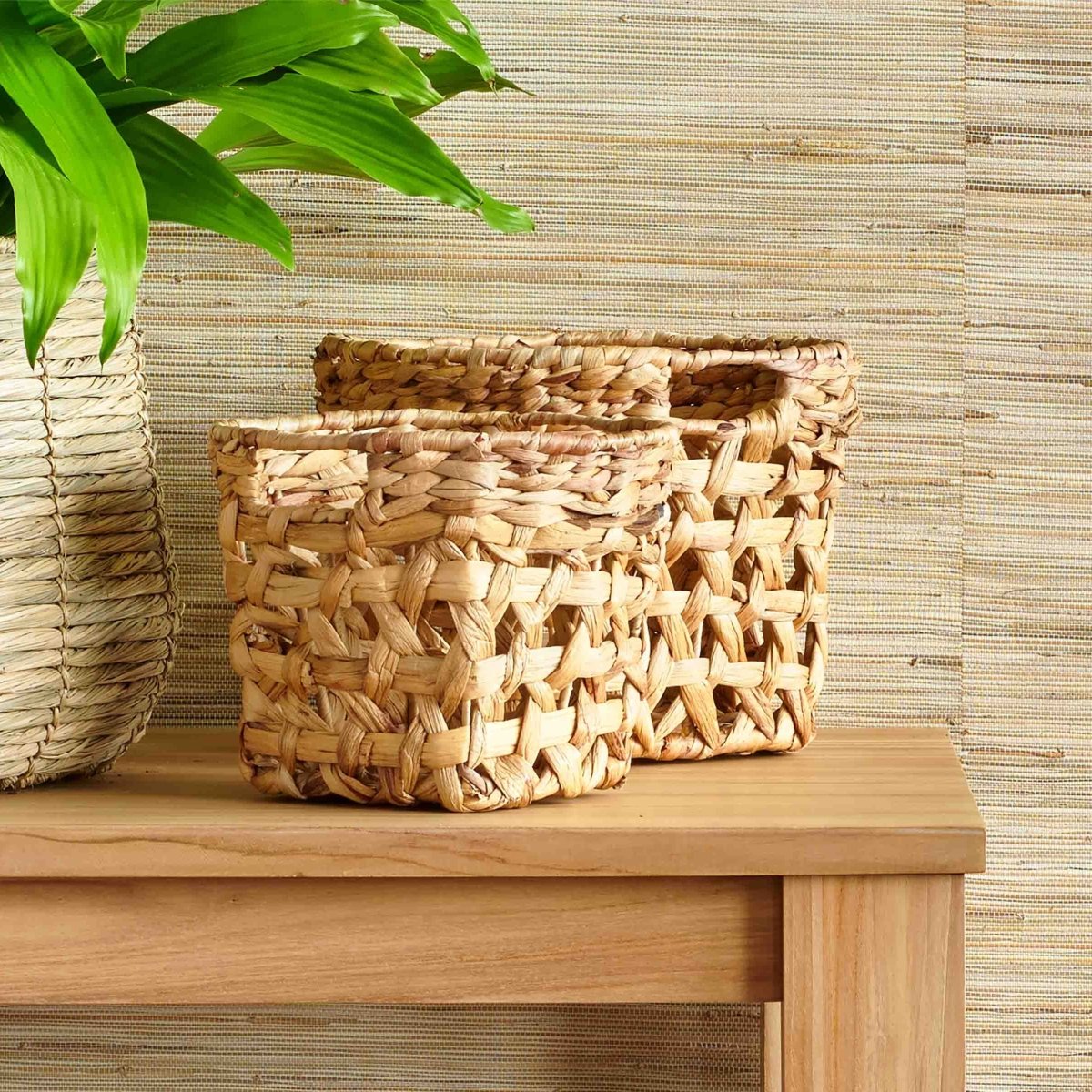 The Trania™ woven water hyacinth basket set delivers practical storage with natural aesthetic appeal. This three-piece collection features baskets crafted from sustainably sourced water hyacinth in a golden-brown finish. Each basket showcases a distinctive diagonal weave pattern constructed over a durable wire frame, ensuring structural integrity for everyday use.