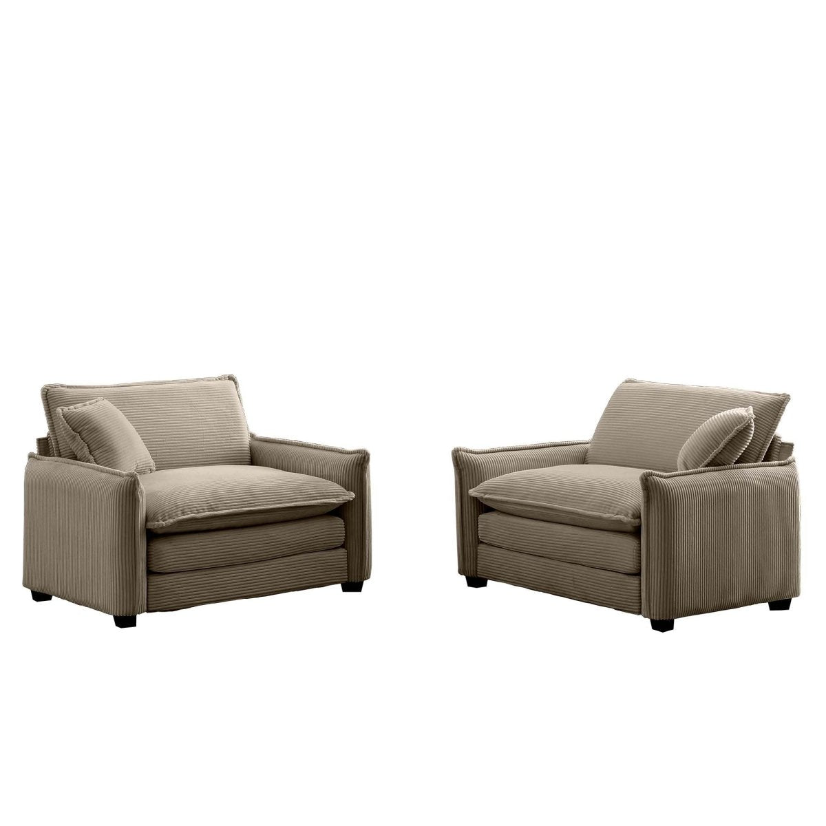 Assembly is required upon delivery. Each armchair in this set provides substantial seating capacity with its 46-inch length. The corduroy fabric upholstery covers memory foam cushioning supported by a sturdy frame designed for daily use.