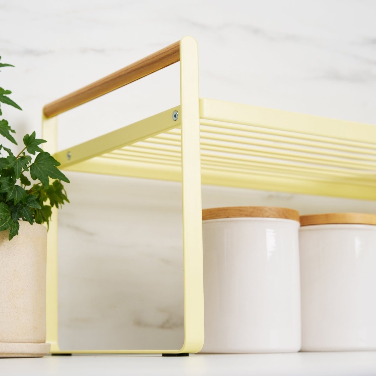 The yellow pear powder-coated finish adds a distinctive pop of color that complements both modern and traditional kitchen styles. The natural wood handles provide comfortable grip for repositioning the shelf as needed. At 23.62 inches wide, this shelf fits standard countertop depths while the 8.66-inch height creates useful clearance underneath.