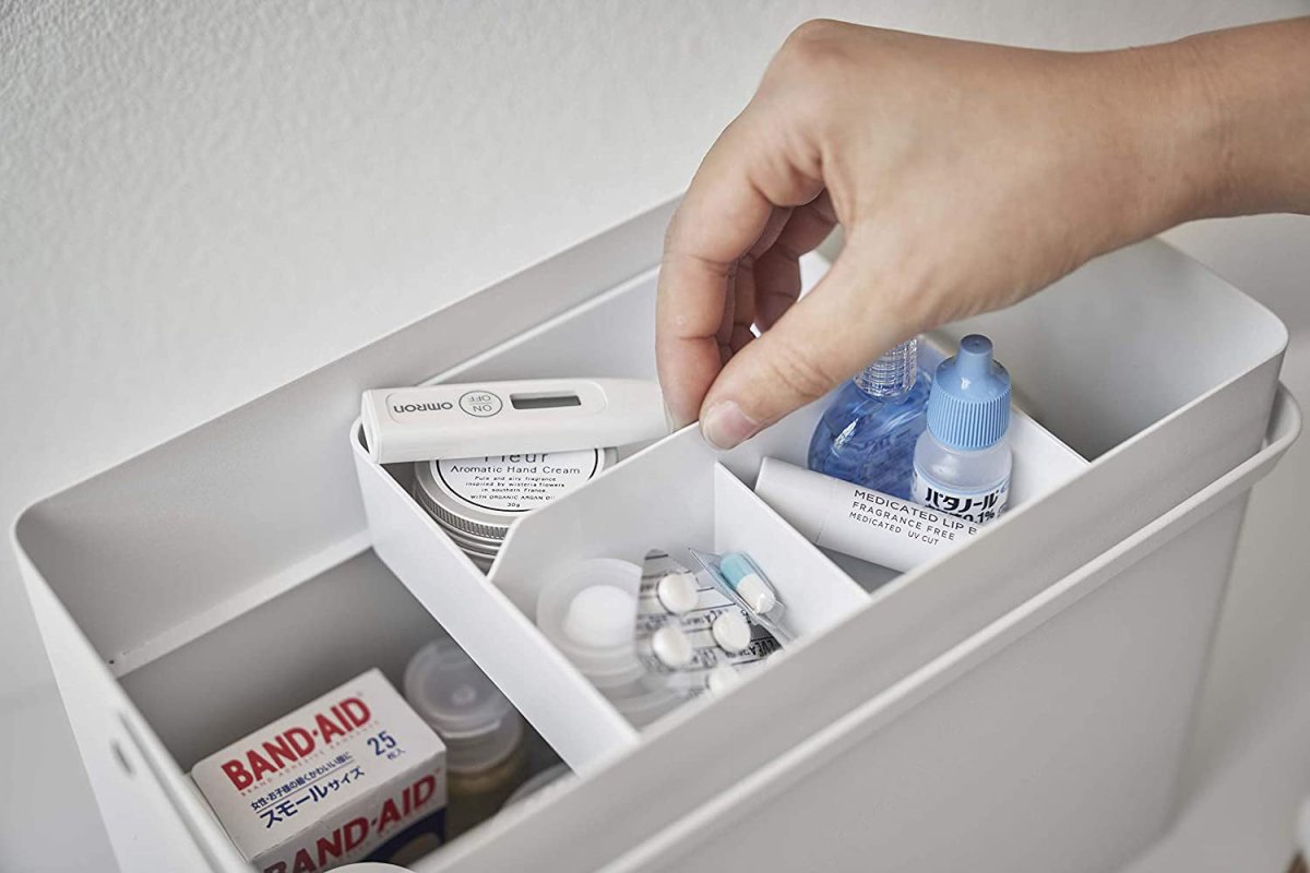 Created with home first-aid kits in mind, this compact, all-purpose storage organizer is perfect for storing odds and ends, whether they be sewing accessories, bathroom products, makeup or more. The nested tray that rests in the upper compartment and wooden lid are the little touches that make this accessory box extra special.