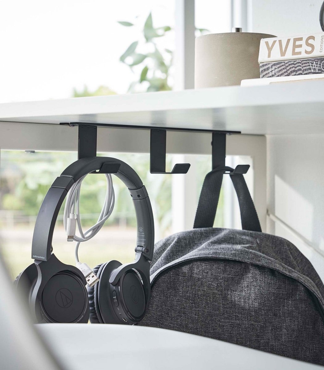 This unassumingly smart, three-hook rack is an easy win for under-desk storage. Simply attach to the bottom of your desk using the provided screws to create the perfect perch for your cables, headphones, and other electronic accessories. The hooks feature a wide design to minimize stress and damage on your purse straps and backpack grab handles while lending a modern aesthetic.
