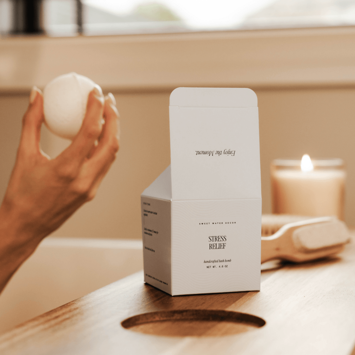 The stress relief blend combines therapeutic essential oil notes designed to calm and restore. Bright lemon and cooling eucalyptus open the experience, followed by refreshing spearmint in the middle, grounded by warm wood base notes. This carefully balanced scent profile creates a multi-layered aromatherapy experience that evolves as you soak.