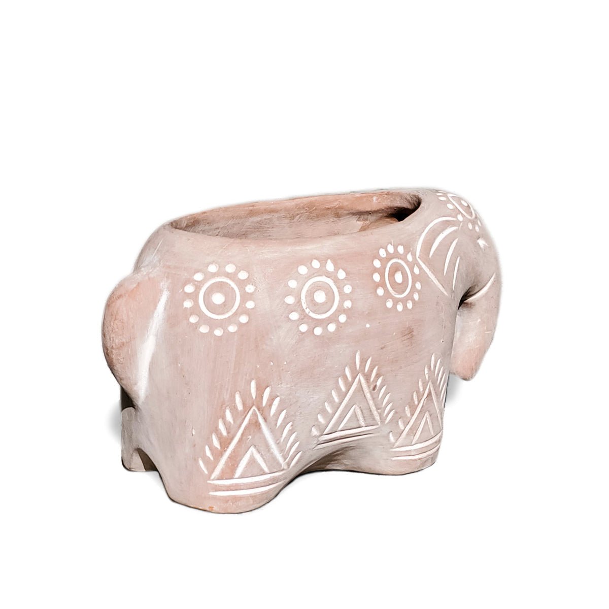 The elephant-shaped planter measures approximately 5" tall x 9" wide x 5" deep, with a planting opening of 5" x 3.5". This size accommodates succulents, small flowering plants, and various green plant materials. The natural terracotta clay provides excellent breathability for plant roots, promoting healthy growth.