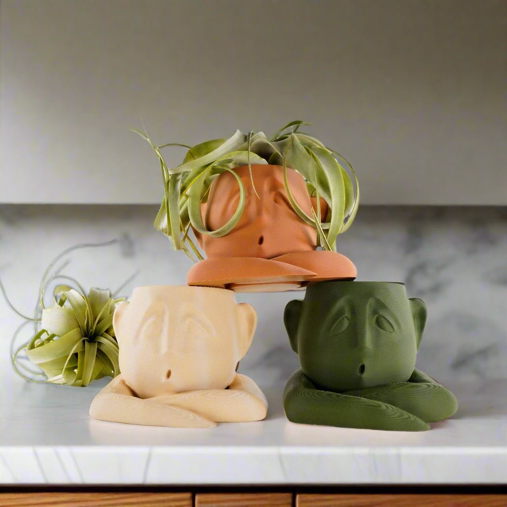 The Shady Man Air Head Plant Pot features a distinctive head resting on crossed arms, creating an artistic statement piece for your space. This abstract face planter works beautifully as a standalone decorative piece or grouped with other head planters for a cohesive display. The design includes a drainage hole for proper plant care, making it suitable for air plants or your own faux succulents.