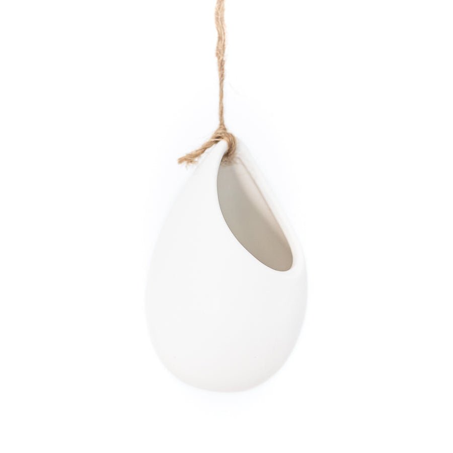 This teardrop-shaped ceramic planter combines form and function in a compact 2"W x 3.5"H design. The ivory finish provides a clean, neutral aesthetic that complements any interior style, while the unique shape creates visual interest whether suspended or placed on a flat surface.