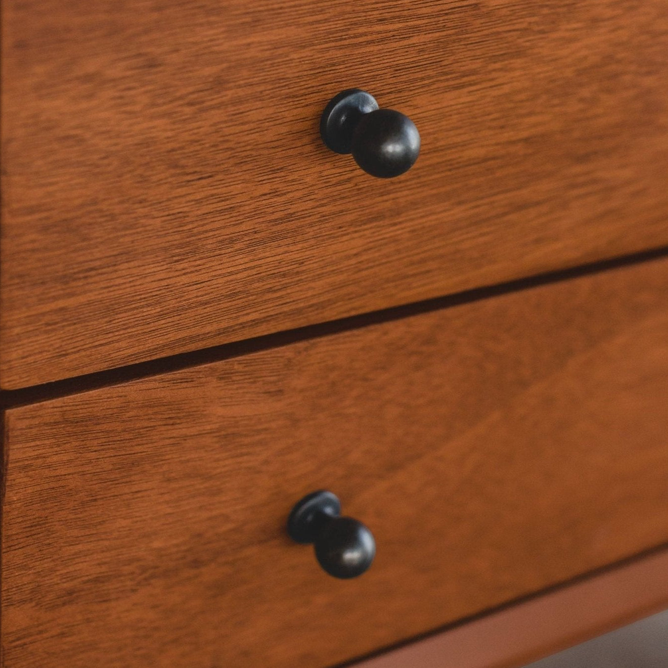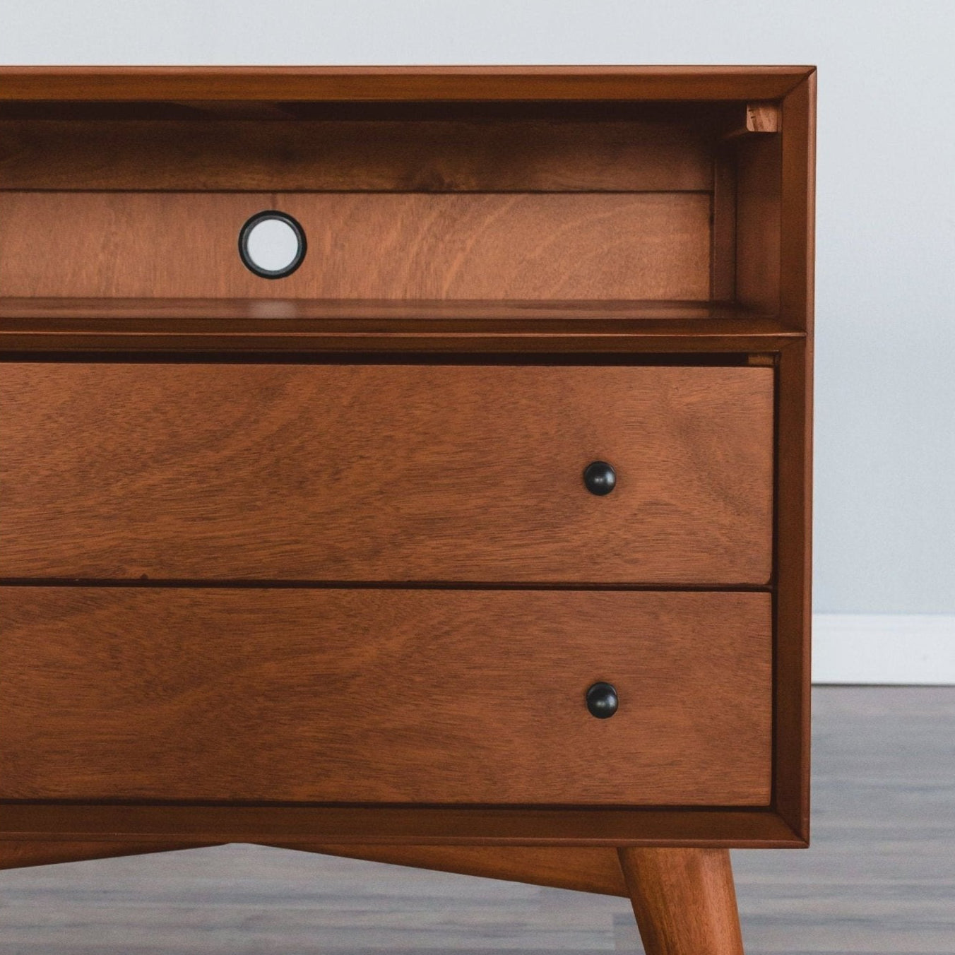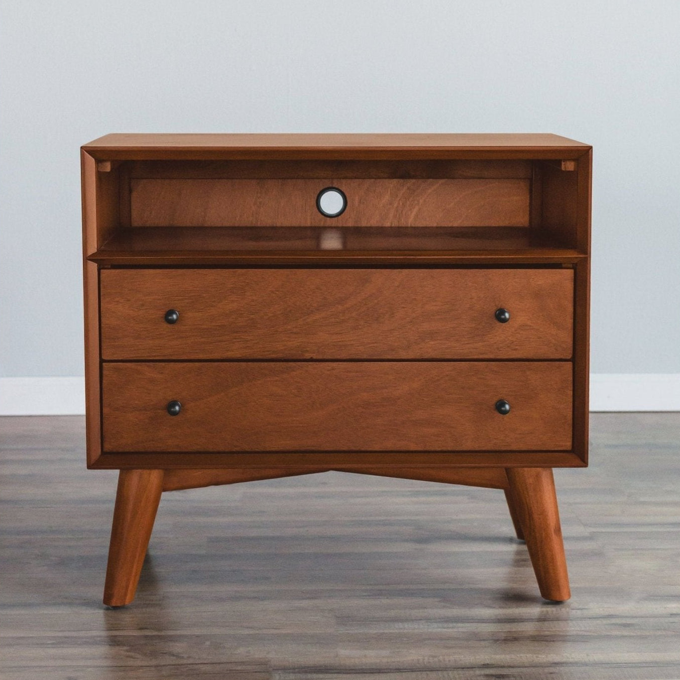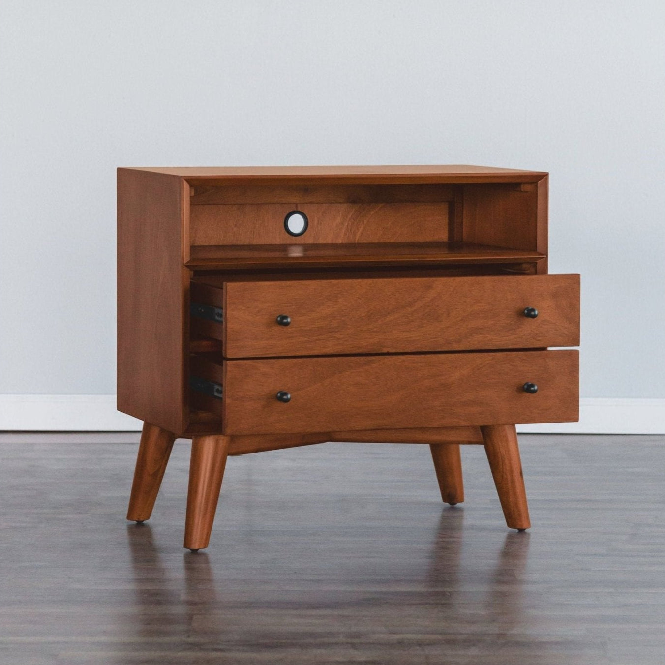 The Flynn Grand Nightstand brings iconic Mid-Century Modern design to your bedside with clean lines, splayed legs, and a warm chestnut finish. Crafted from sustainably sourced solid mahogany, this substantial piece combines timeless aesthetics with practical storage that serves you night after night.