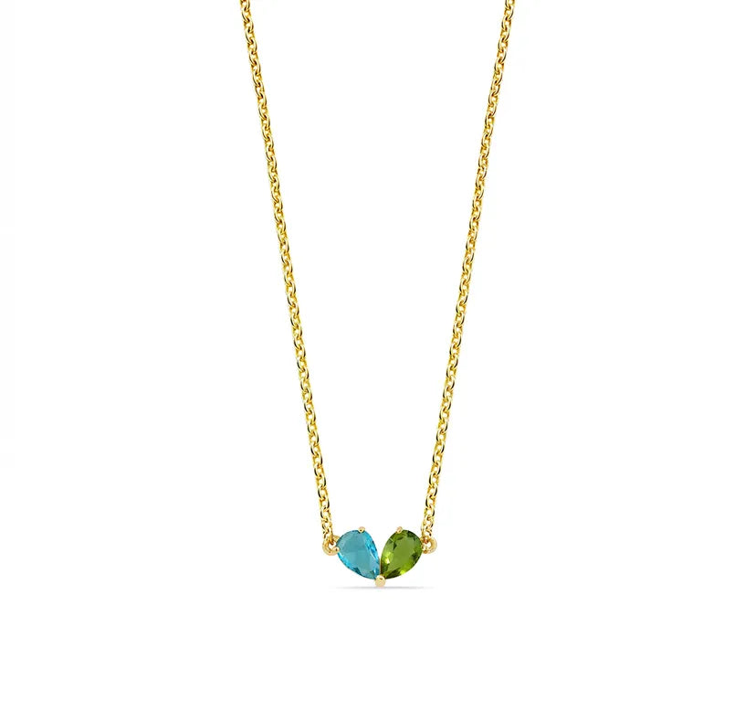 Fresh, colorful, and full of charm — this Ocean Topaz & Peridot Toi Et Moi Necklace pairs a cool pear-cut ocean topaz with a vibrant peridot in a graceful dual-stone setting. Inspired by the French phrase meaning “you and me,” the toi et moi silhouette is as meaningful as it is beautiful. Set in 14K yellow gold plating with E-Coating, it’s a piece that brings fresh color and timeless elegance to any outfit.