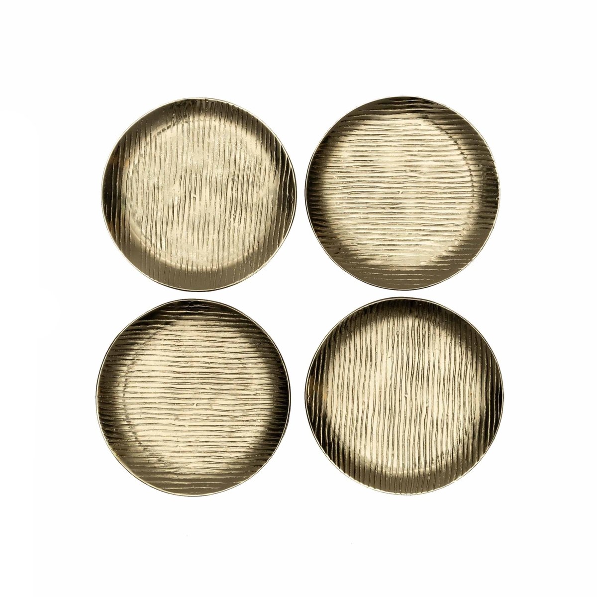 The Wexler™ set of 4 golden-toned aluminum dishes offers a multitude of uses. Crafted by hand, these dishes can serve as coasters, small appetizer plates, or a trinket tray for your most petite treasures. The possibilities are endless!