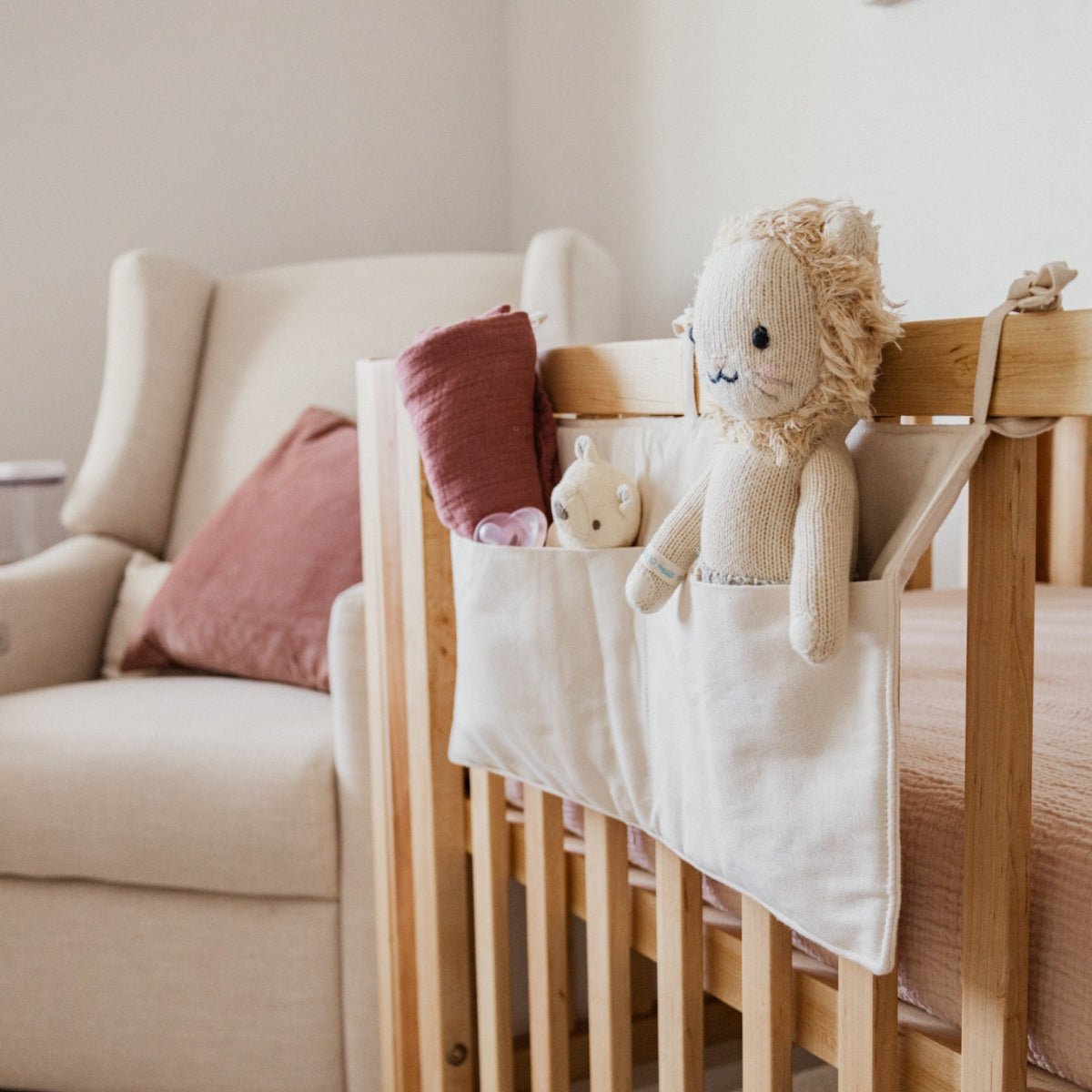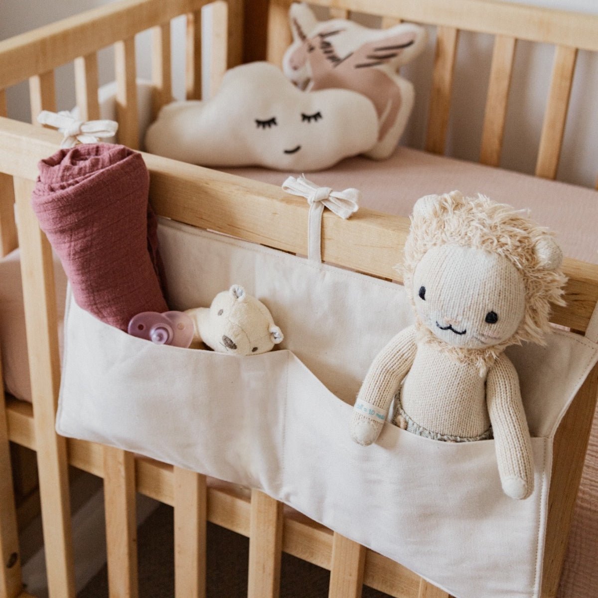 This natural canvas crib organizer provides practical storage for baby essentials, keeping diapers, toys, wipes, and bottles within arm's reach. Designed to hang securely on cribs, changing tables, or bedsides, this organizer helps maintain a tidy nursery space while ensuring everything you need is immediately accessible during nighttime feedings and diaper changes.